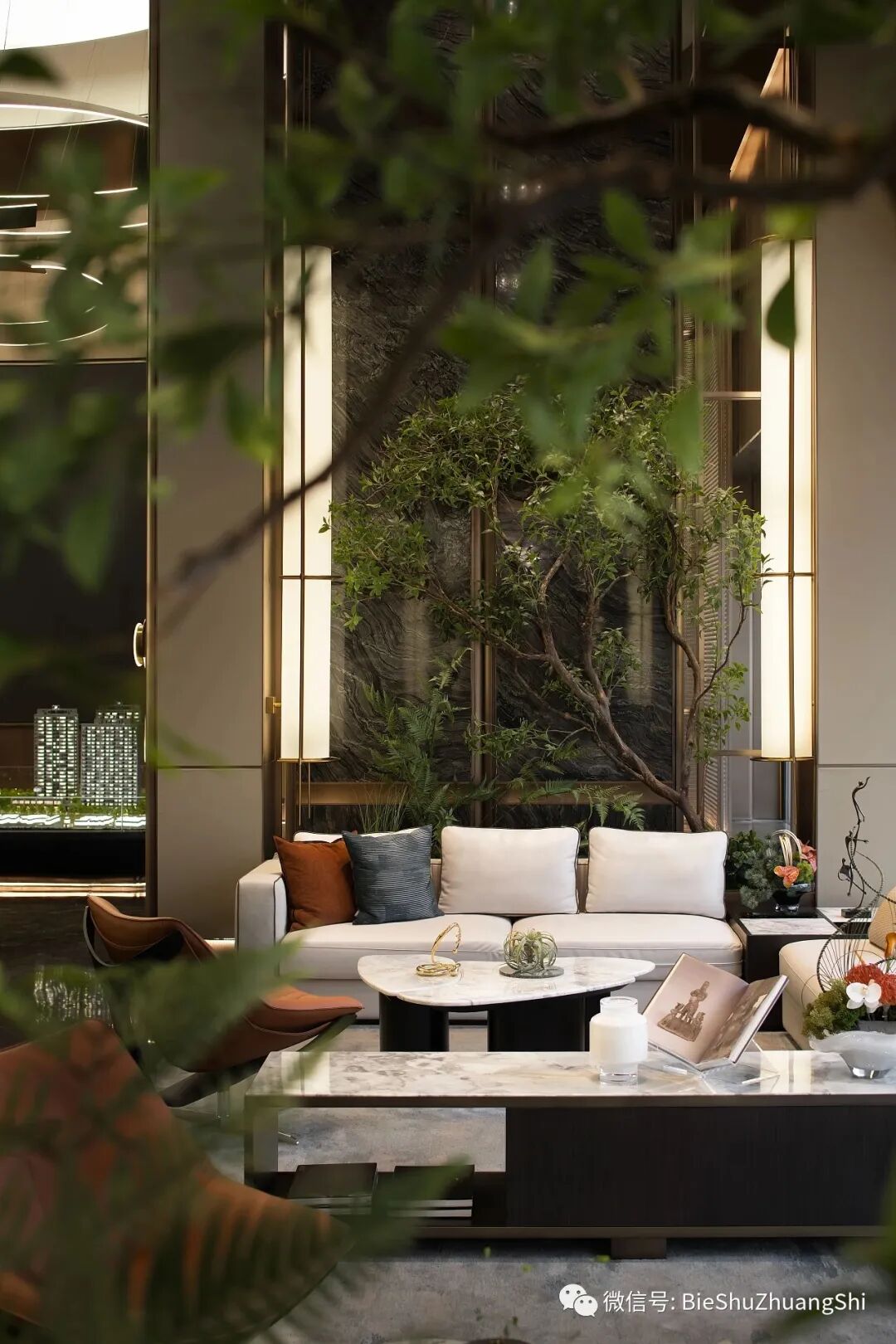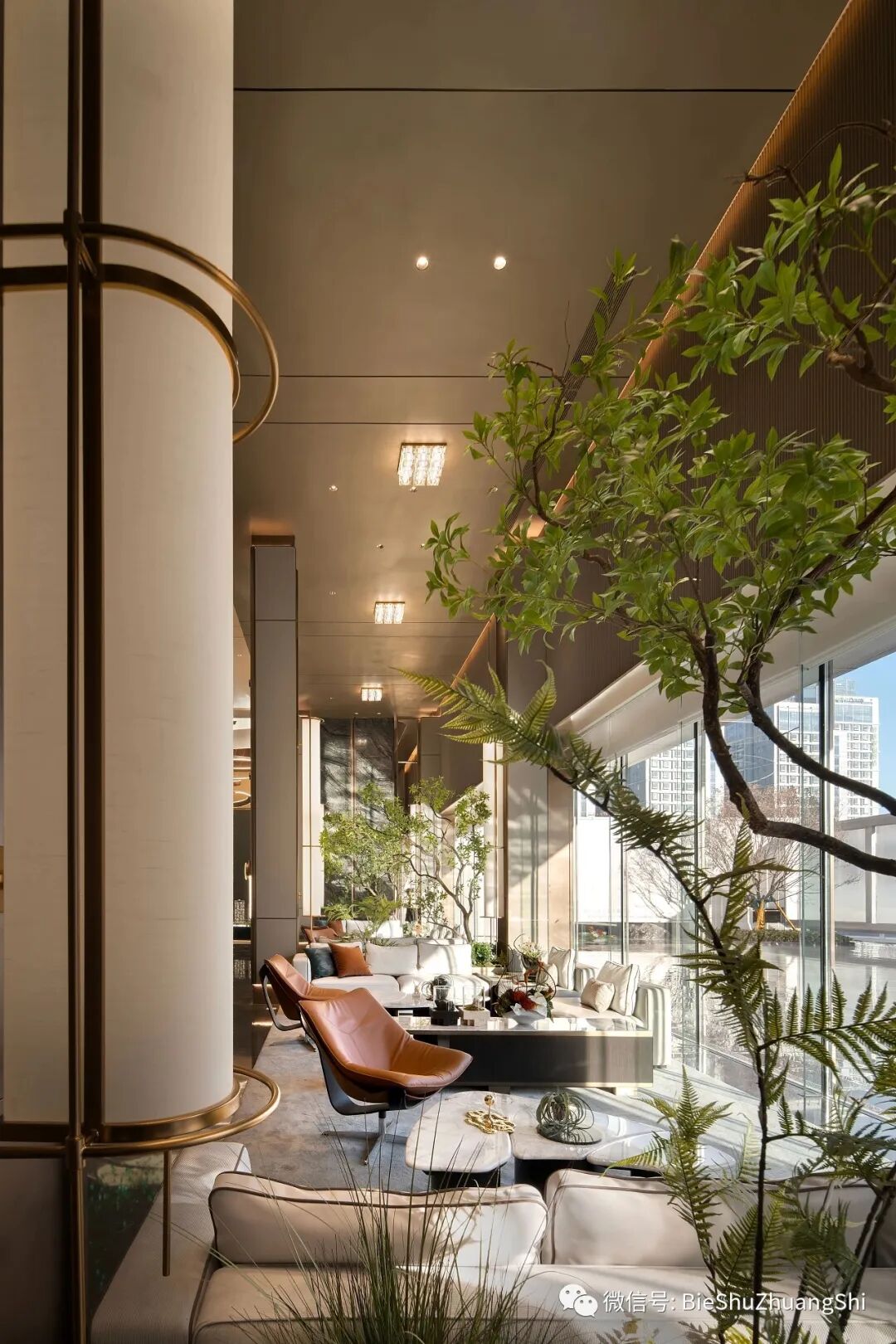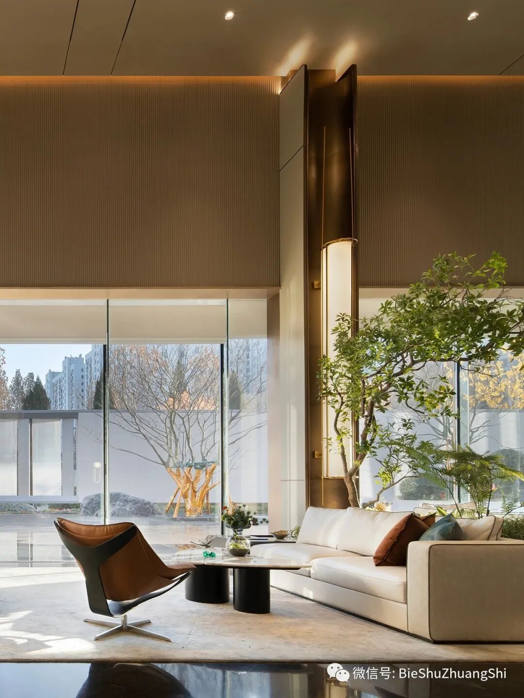 洽谈区以借光影和室外景的变换相映,把室内的建筑空间艺术创造,光线在空间中游隙,形成一场动态美学与静态设计的对话,让明与暗的层次、虚与实的对比、形与影的竞走,更加丰富。
