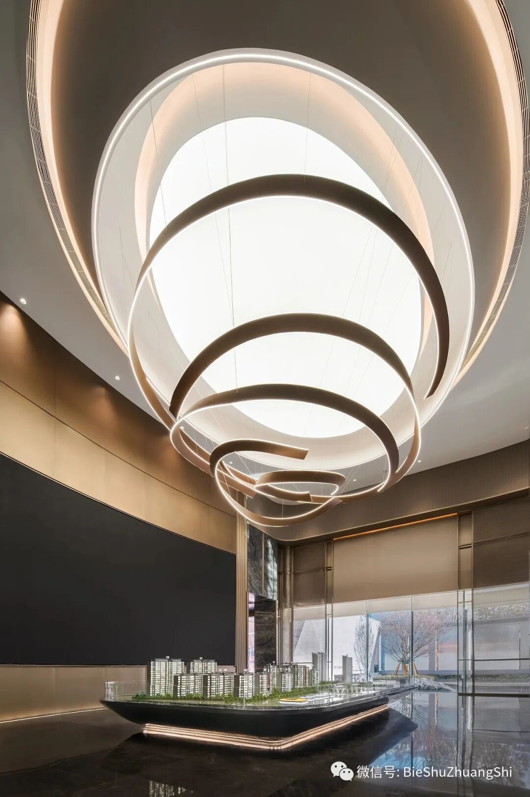 沙盘区轩朗端秀,中空高阔,洽谈区实现功能的衔接,视觉形成互补,视觉中心的灯具犹如泉源,将本地的水韵流到访客心中,在艺术与设计间游弋,从空间到器物,恰如其分的表现了高端雅致的调性。