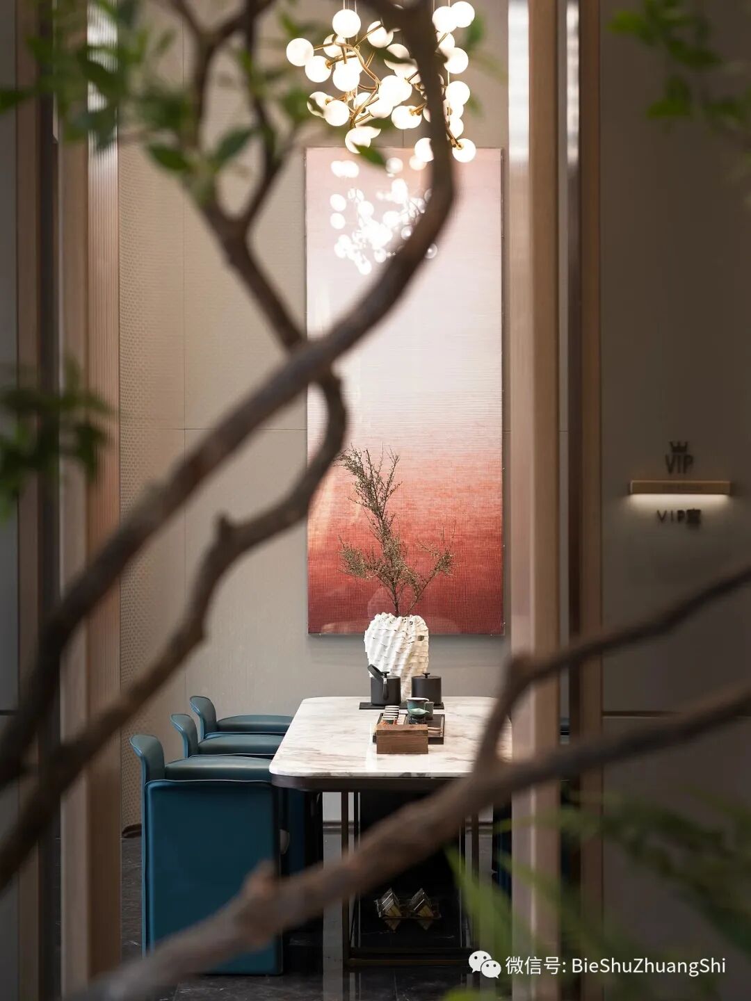 设计配套有单独的VIP区,这里不仅可以供访客坐下来品一杯香茗,更是洽谈事情的好去处,在赭红色的画作之间,在深绿色的茶椅之间,在绿植围就的荫凉之下,皆是自在的艺术。