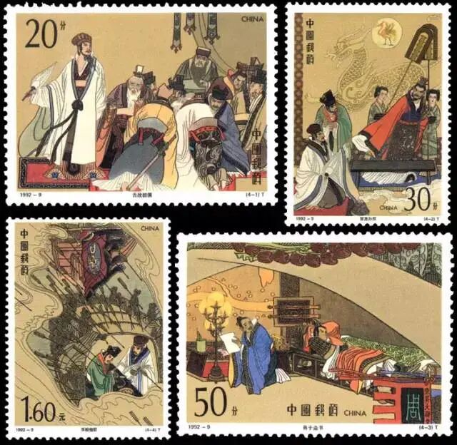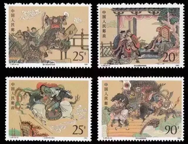 【三国演义(二)】特种邮票:1990年发行,整套邮票以连环画的形式表现故事情节, 线描技法绘制, 配色古朴,场面生动,繁而不乱。