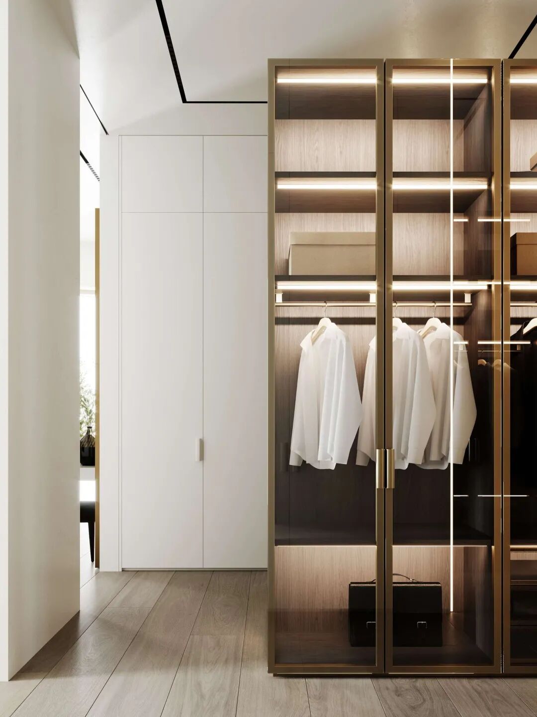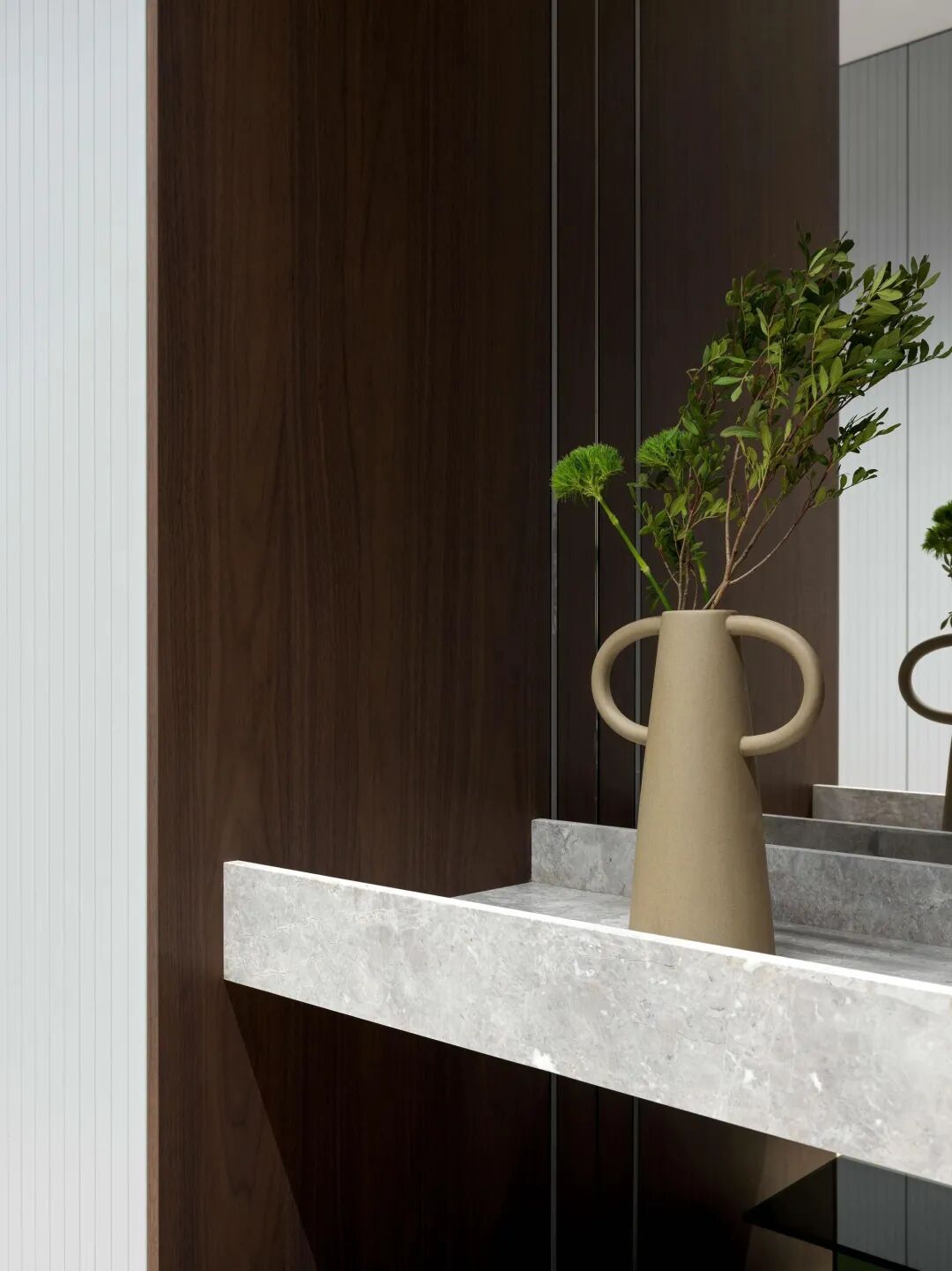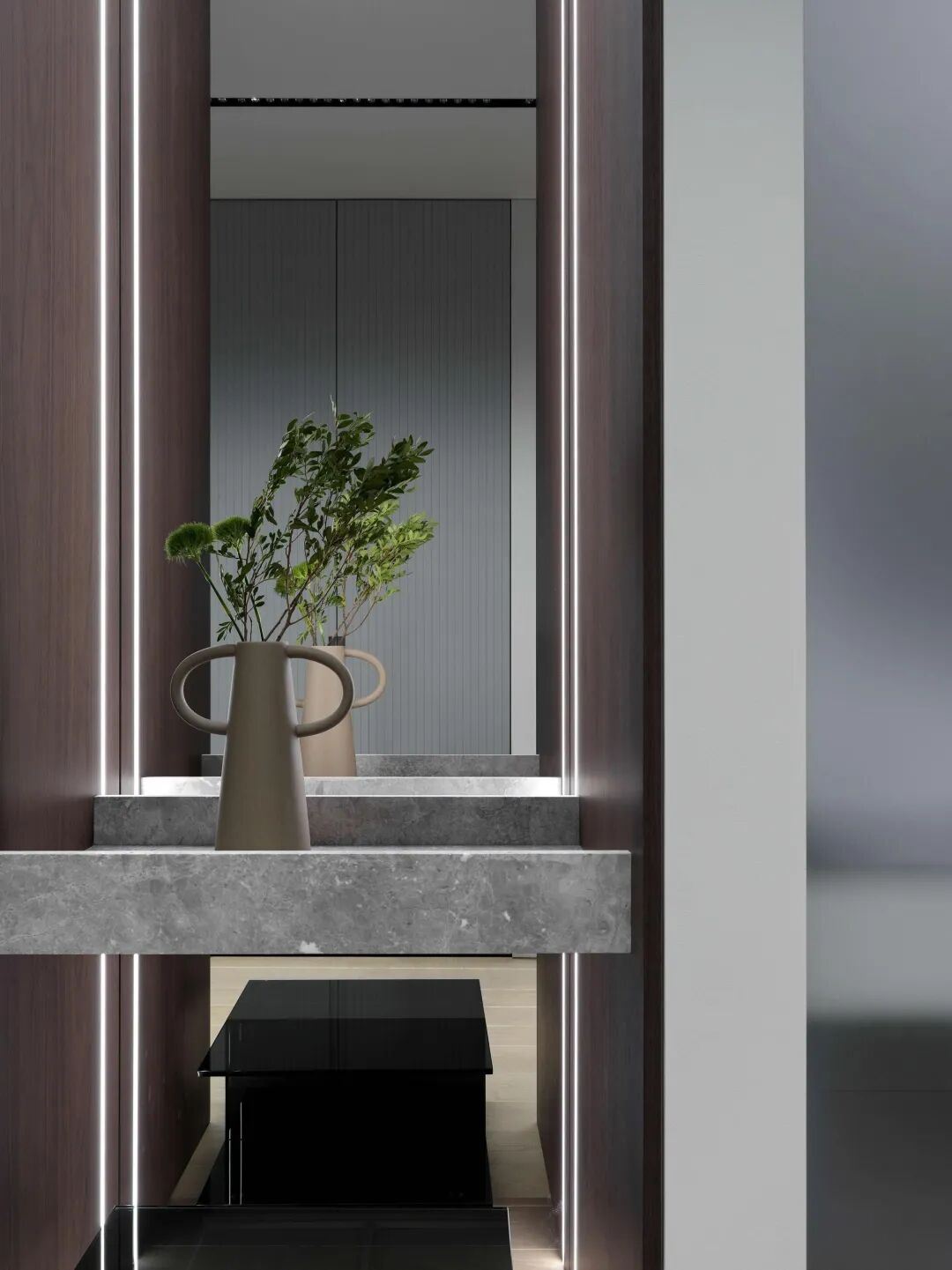 梳妆台融合在背景墙里,细而高的线条勾勒出女性的美丽。