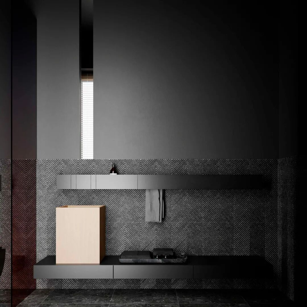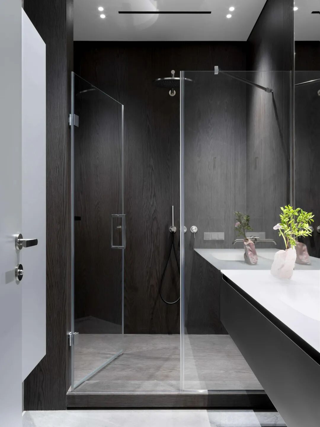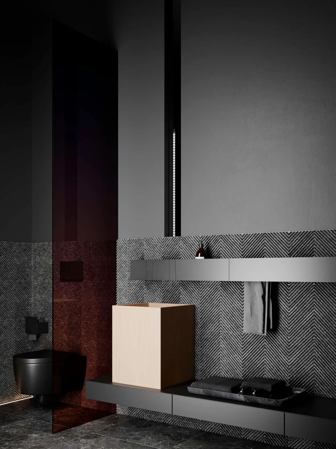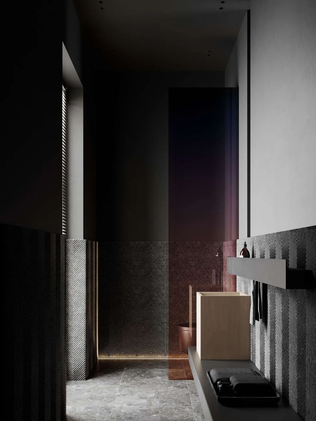 明亮的垂直镜子和彩色玻璃,柔化了两条金属水平线隔板。上面是内嵌水龙头和毛巾架,下面是置物架。浴室里的木制水槽,使全黑的空间更加丰富。