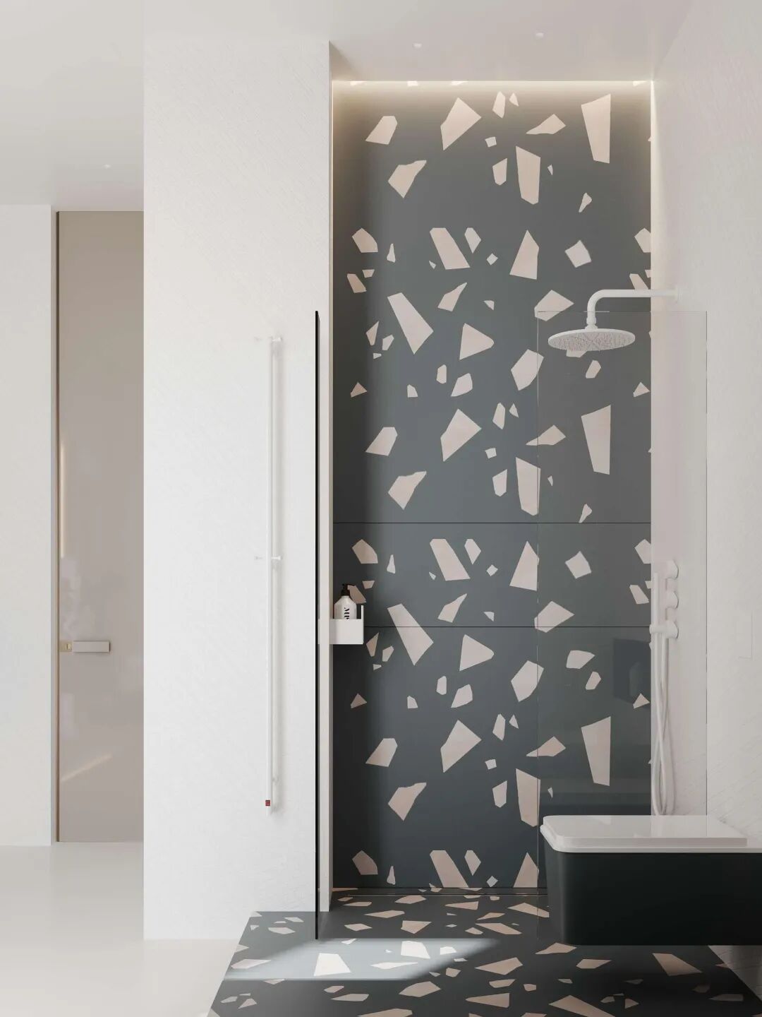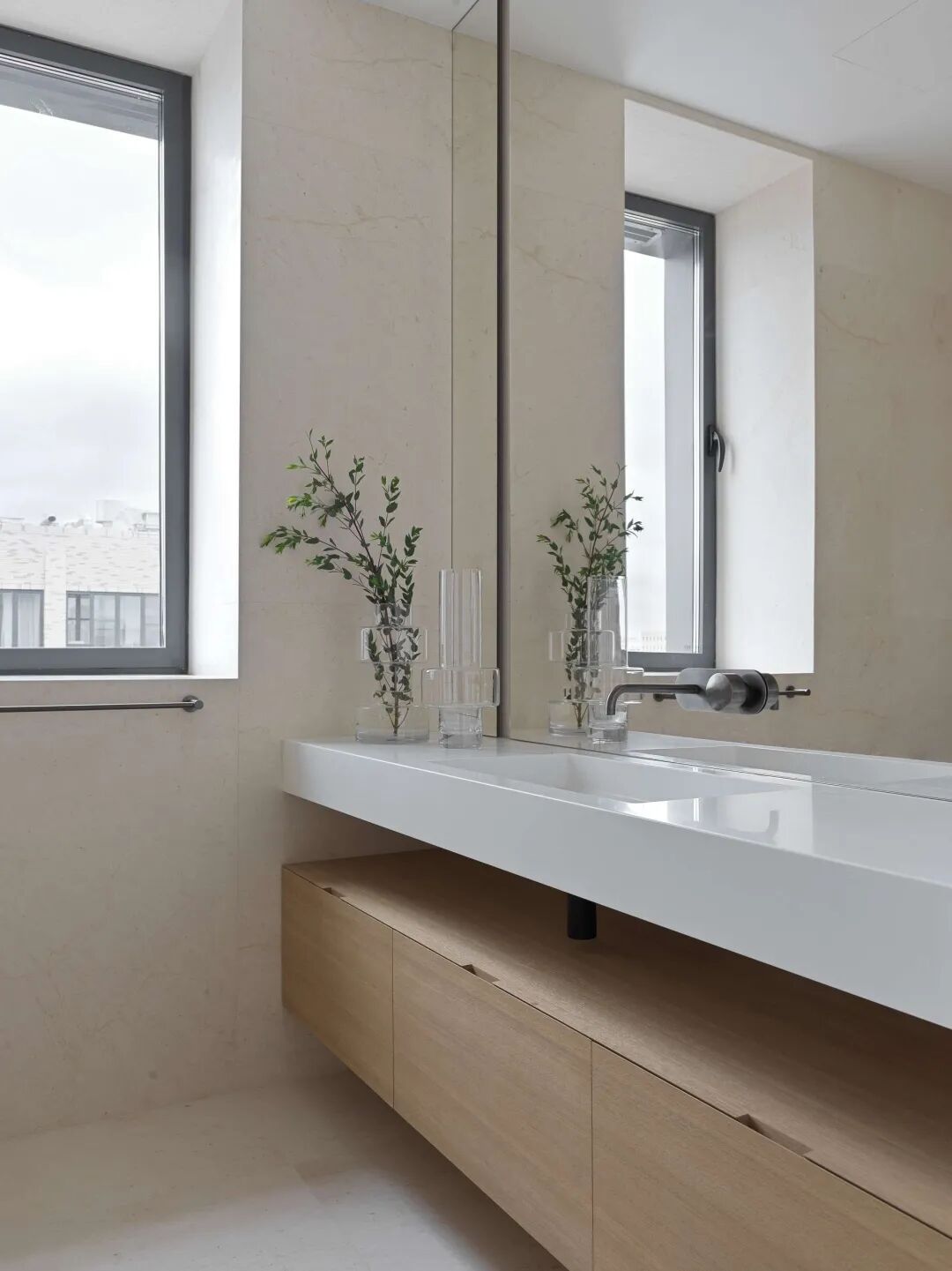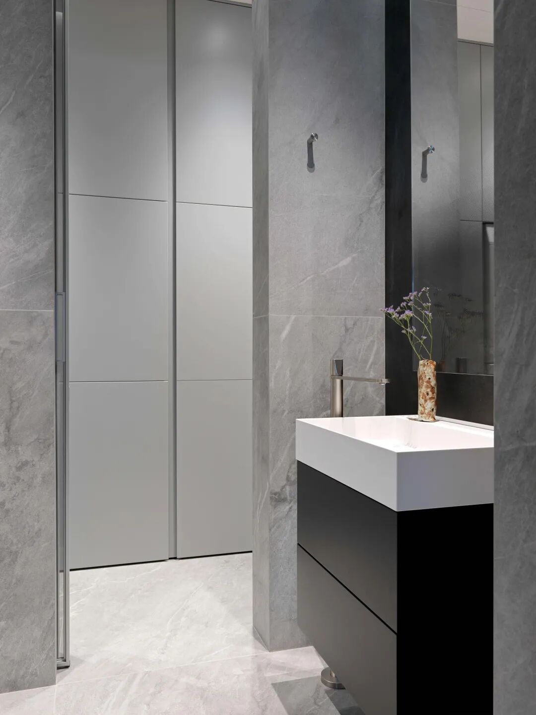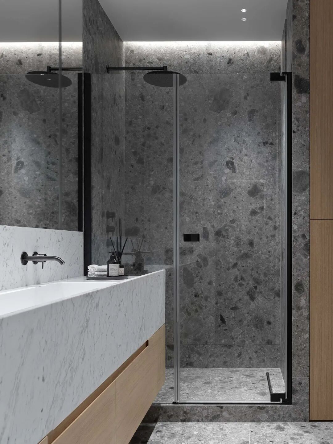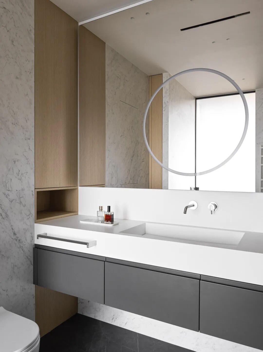 浴室采用了丰富又复杂纹理的大理石,置身于这样的空间中并与之互动,可以给你丰富的审美体验。