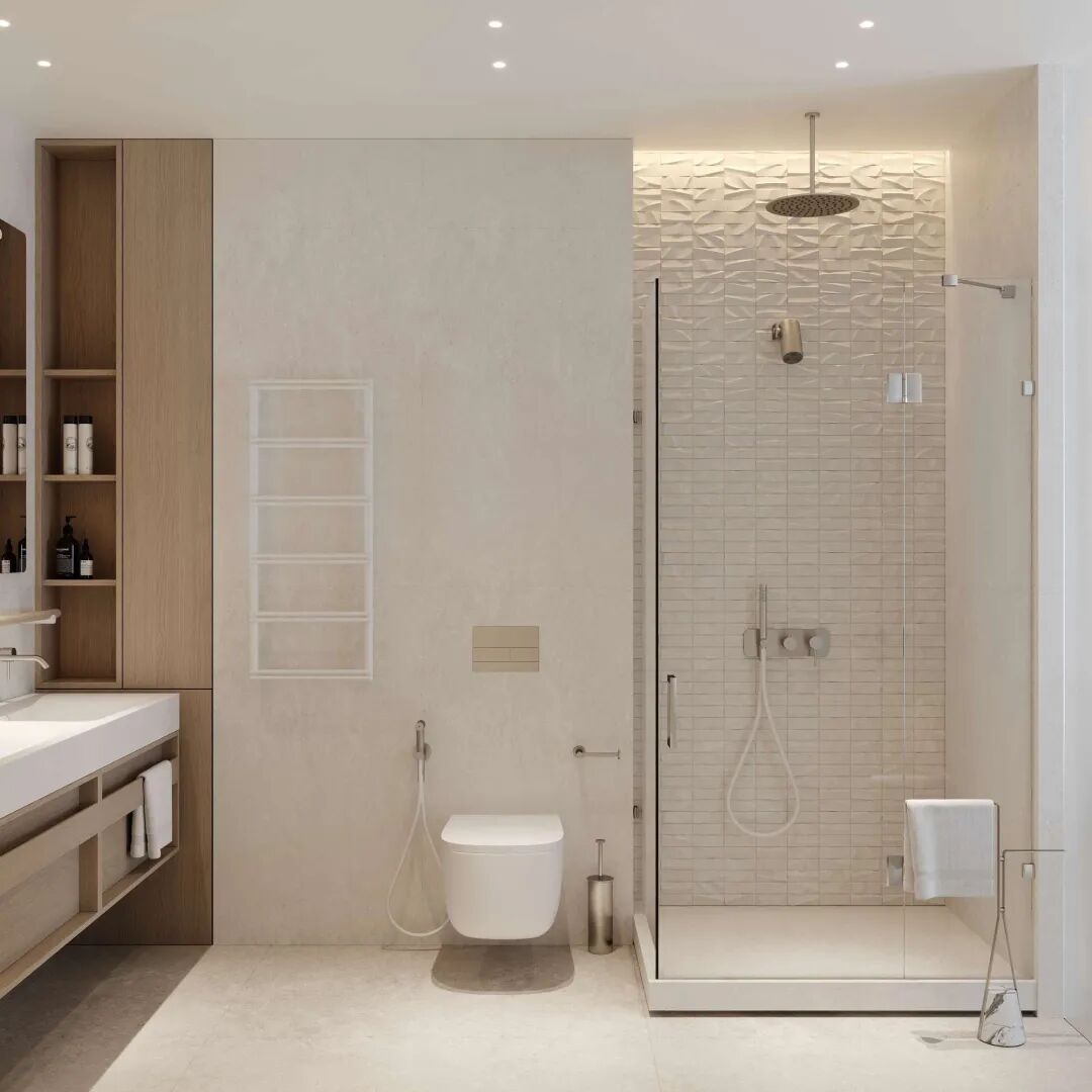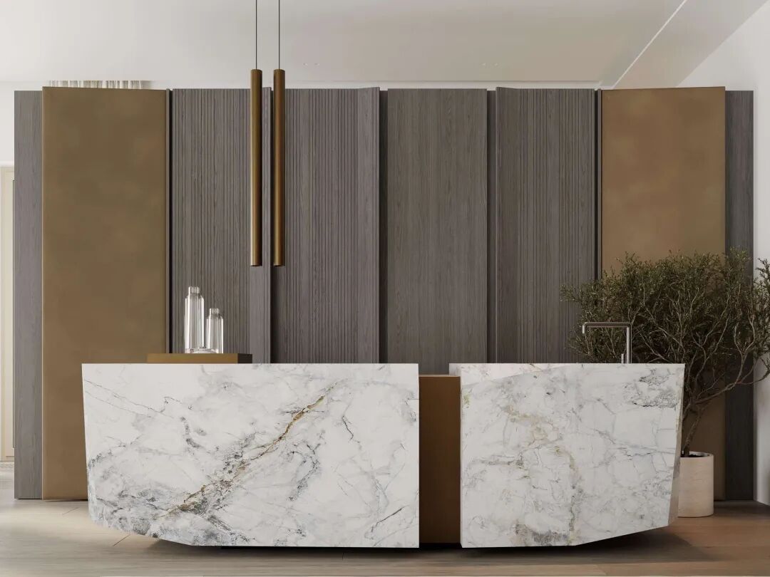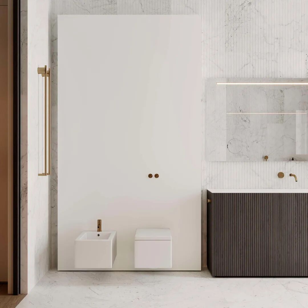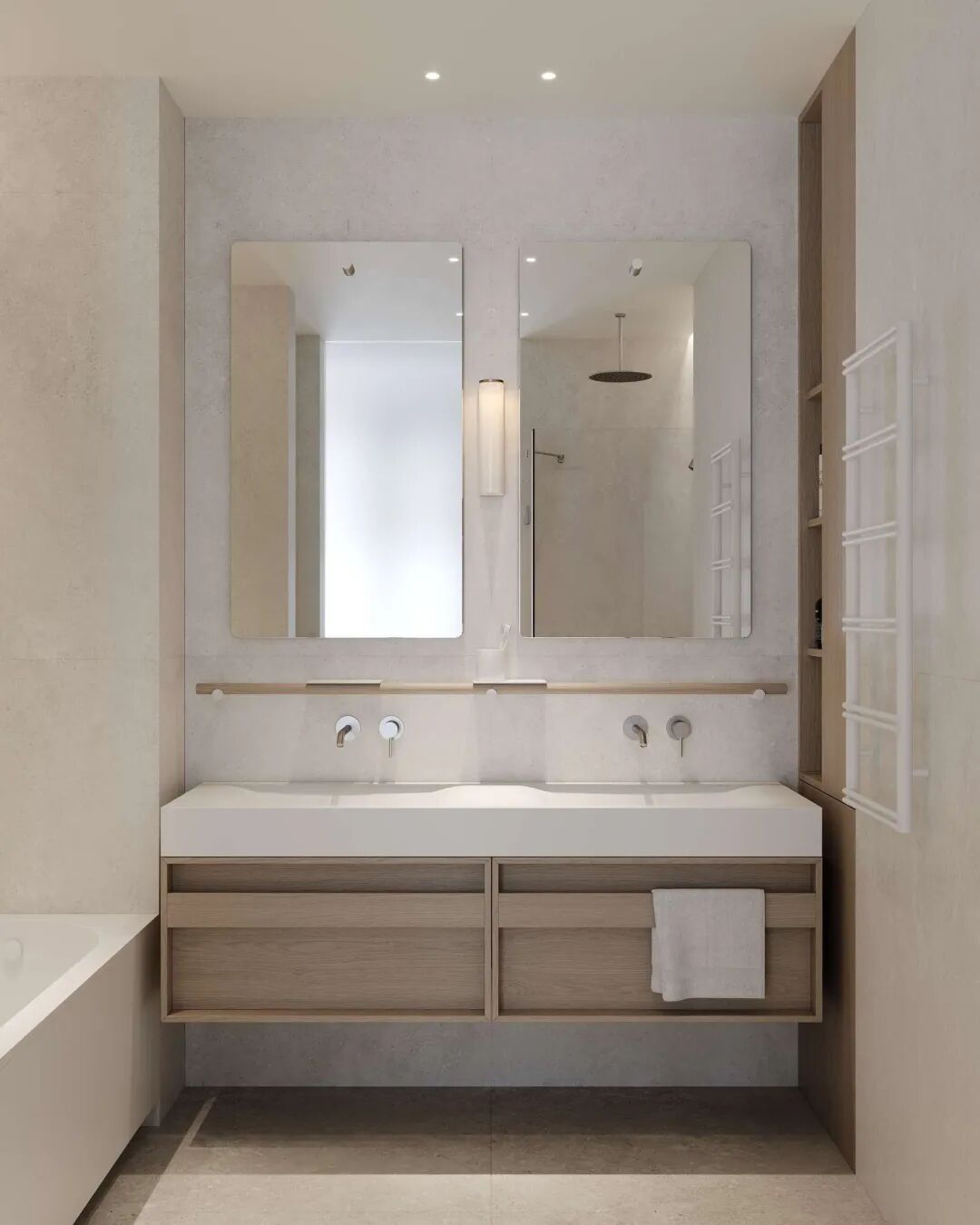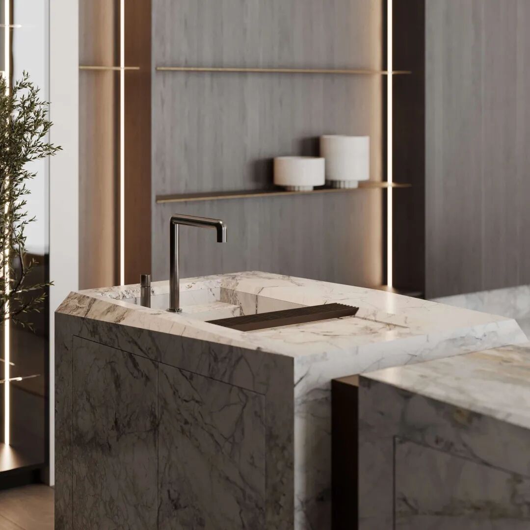浴室采用了丰富又复杂纹理的大理石,置身于这样的空间中并与之互动,可以给你丰富的审美体验。