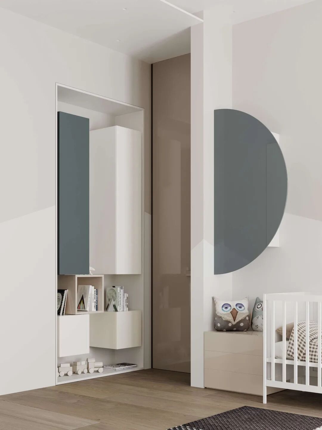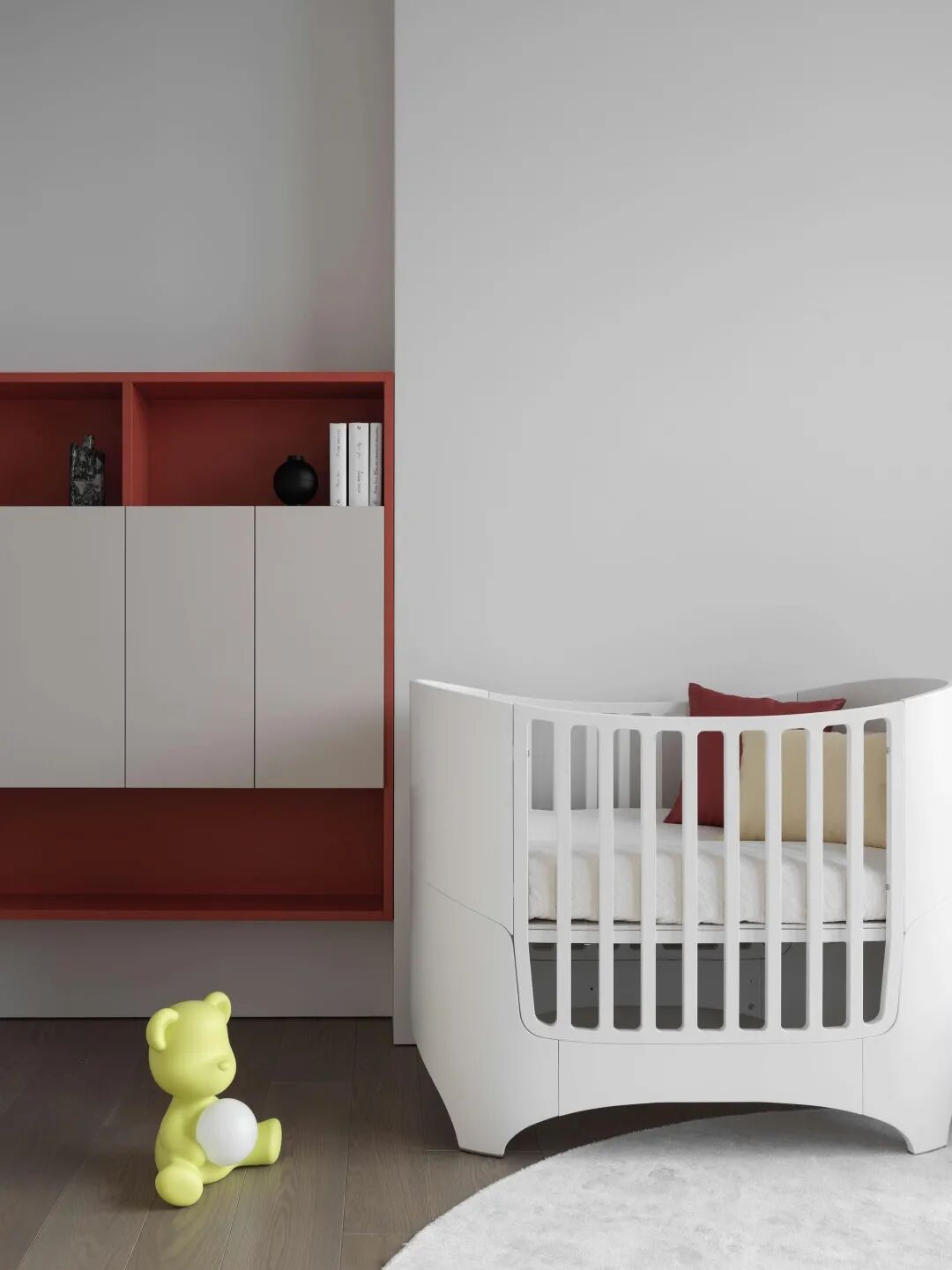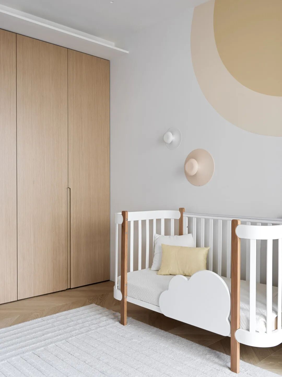 婴儿房沿用了墨绿色调和木饰面的基调,搭配了暖色的圆形装饰,更温柔。