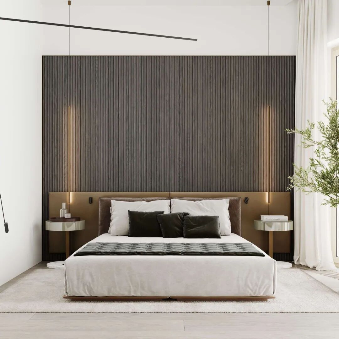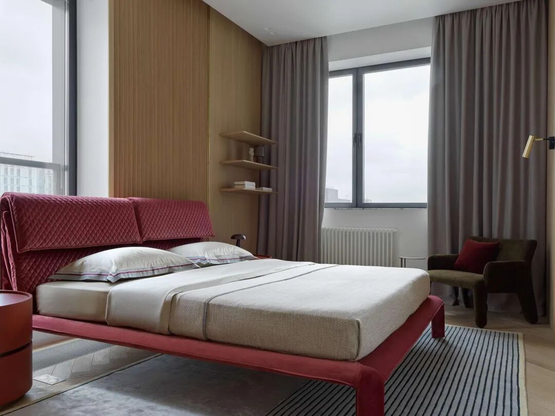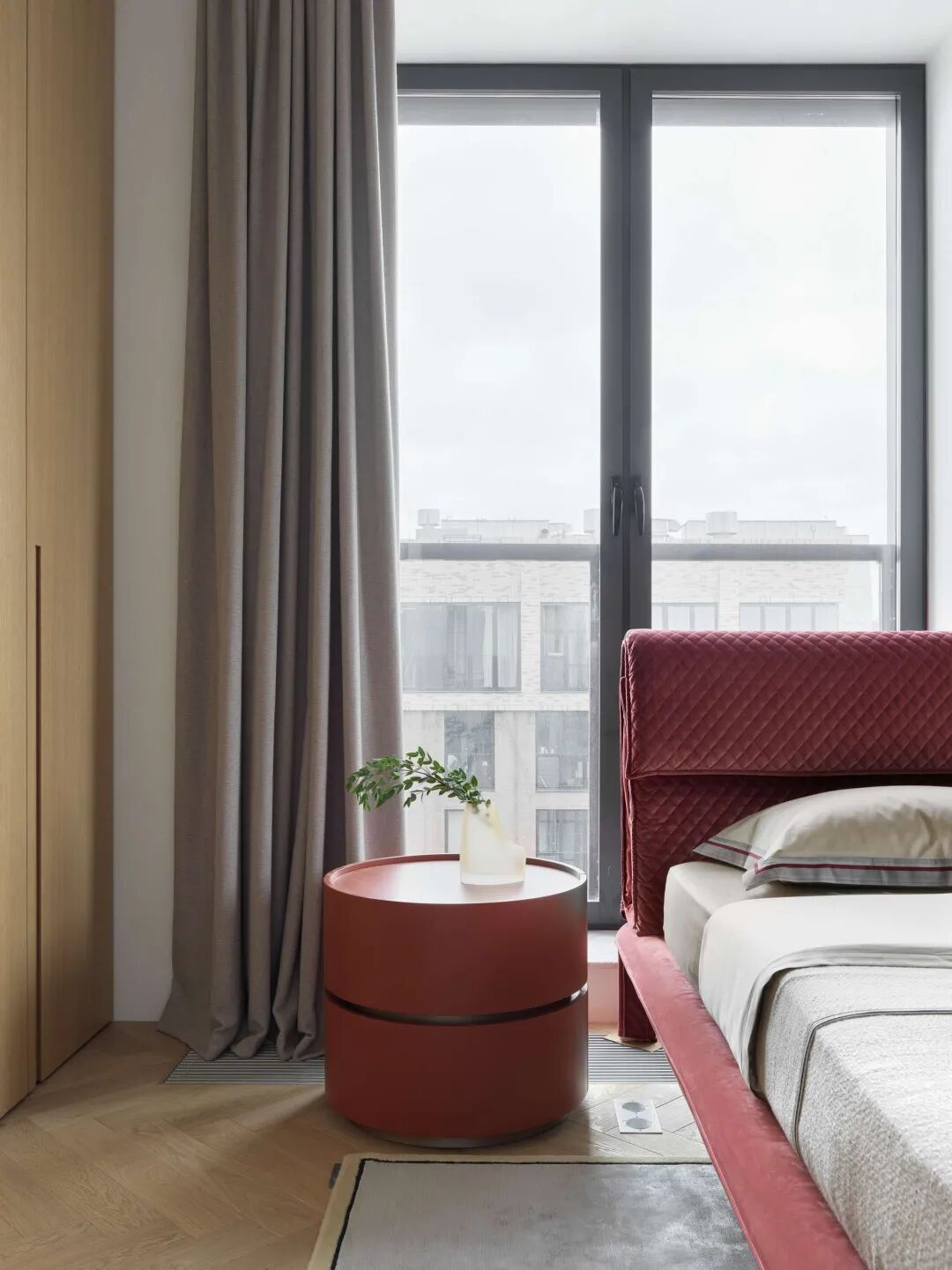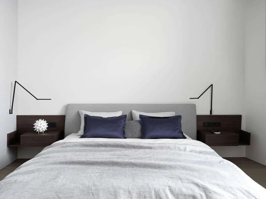 卧室的没有很女性化设计。相反,在这里我们有一个轻盈的色调,还有严格完美的线条比例。