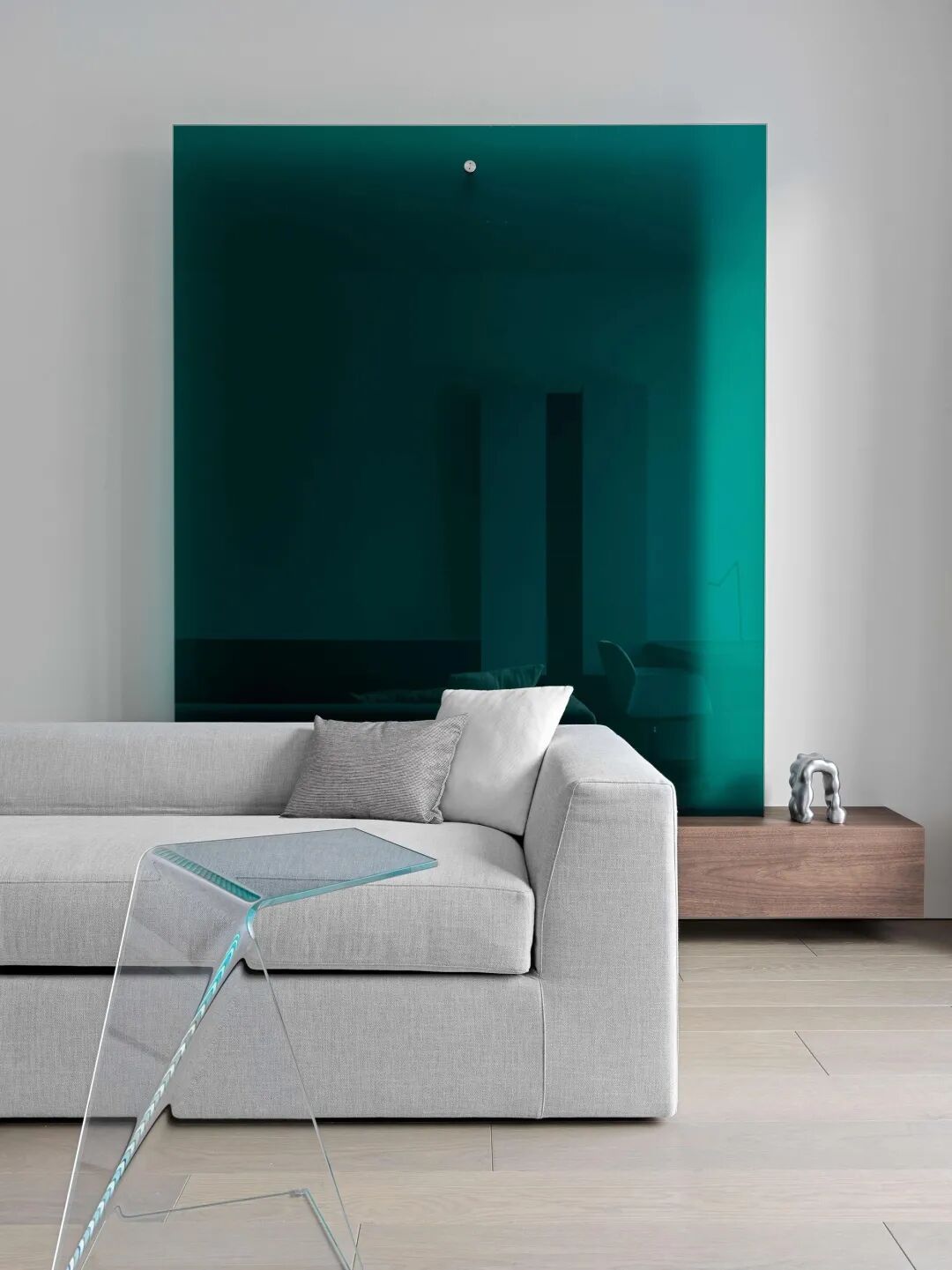 书房空间同样采用了玻璃装饰画和玻璃家具:几何玻璃茶几。
