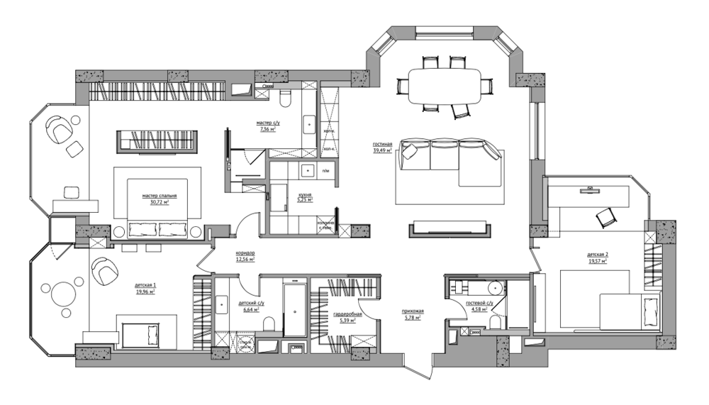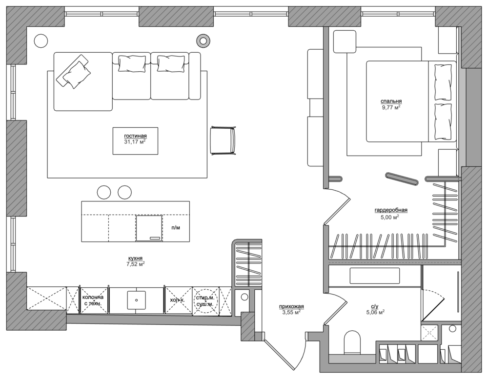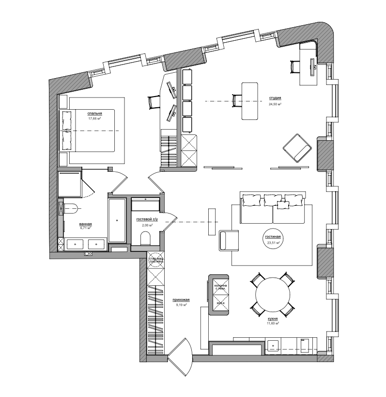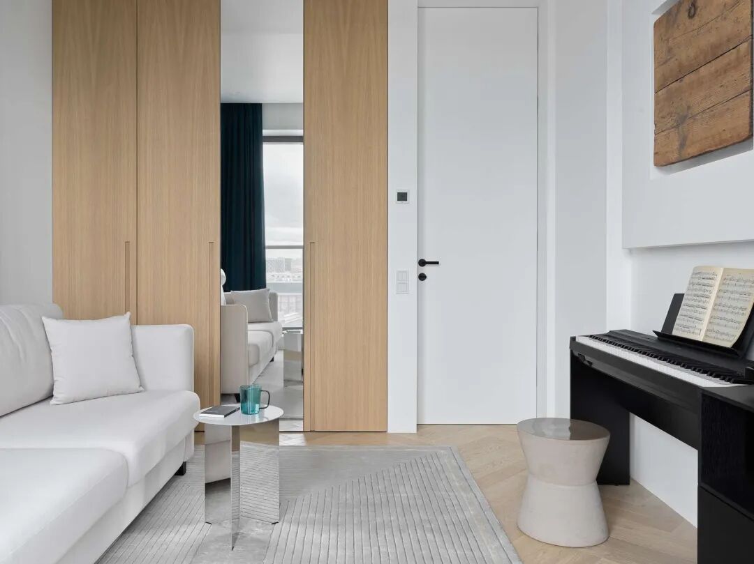 VTB是一个高品质建筑,它有自己独特的曲线和清晰的几何形状。当你进入公寓时,首先映入眼帘的是一个悬挂在两面墙之间的木制玄关柜。在它后面,您可以看到公寓的公共区域。通高的穿衣镜和木柜之间有完美的比例关系。