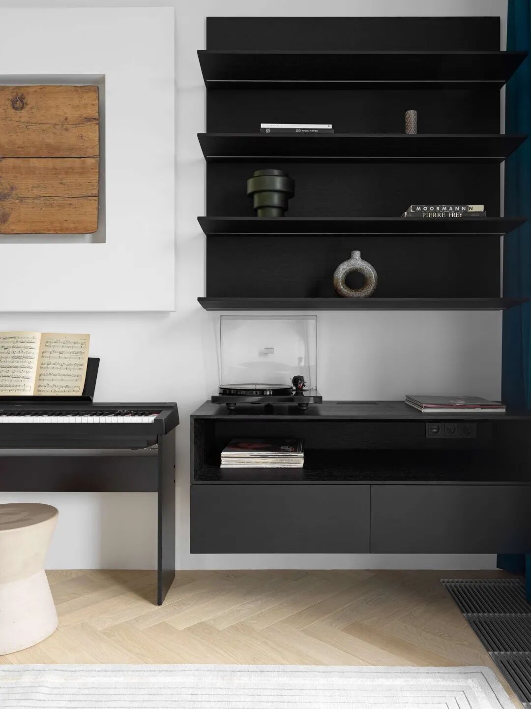 该项目的亮点是公区通向工作室的大型滑动木制隔板。设计师找工厂专门制作了这种隔断结构。工作室是一个工作空间,柜门关闭时,这是一个完全独立的房间。同时也可以打开隔板以创建更大的公共区域。隔断布置的四种选择给了空间的不同印象。