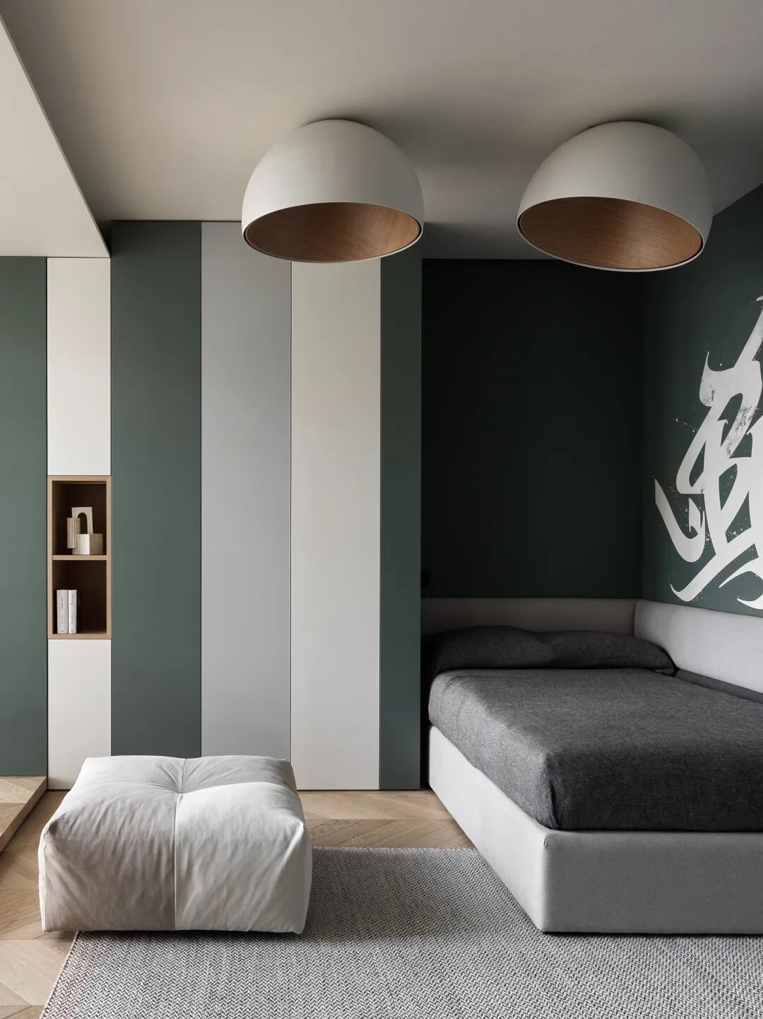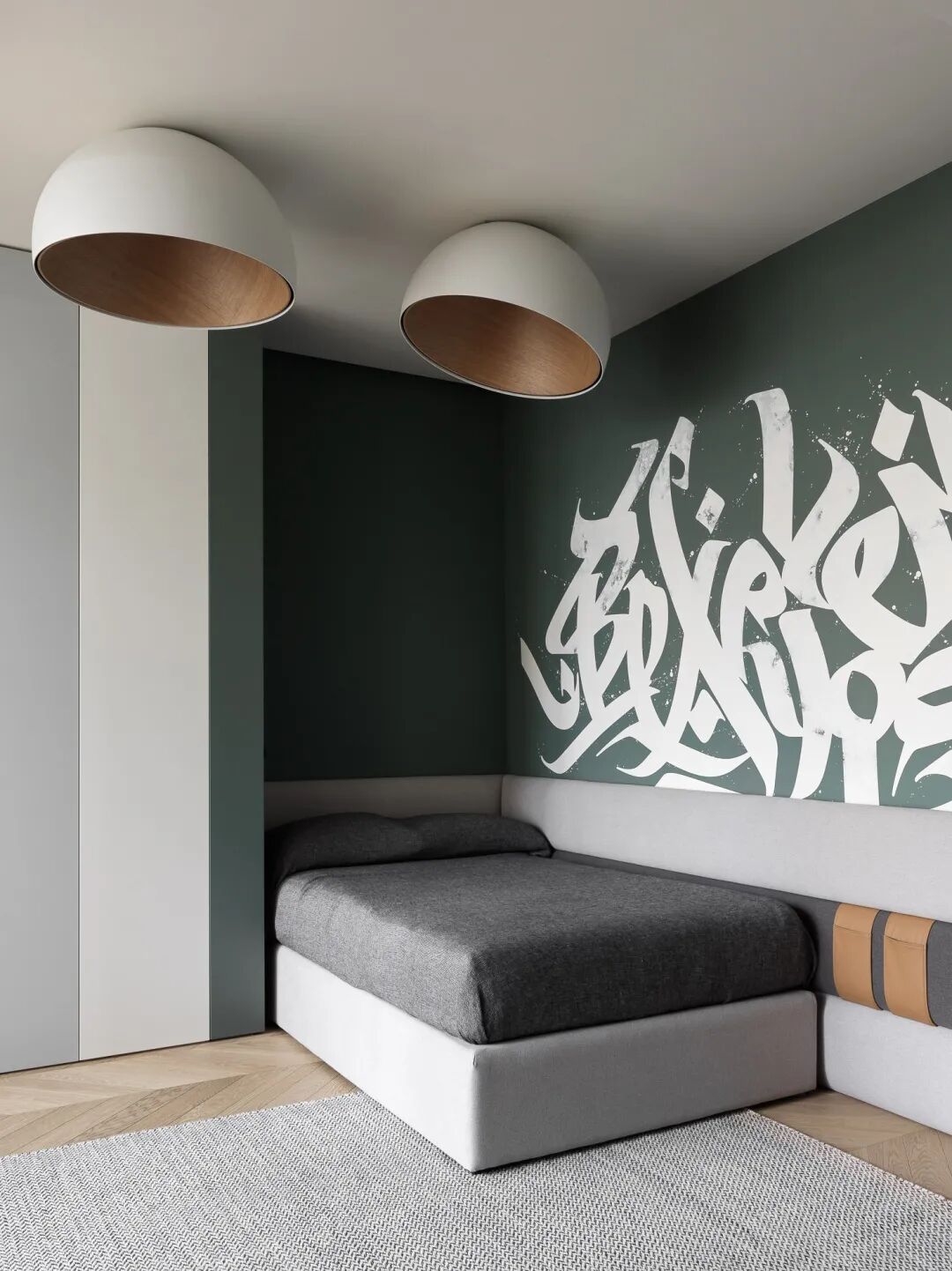 大儿子的卧室用了墨绿色背景墙,蛋壳型的吊灯充满童趣。卧室里学习桌的设计,让孩子有独立的学习空间。