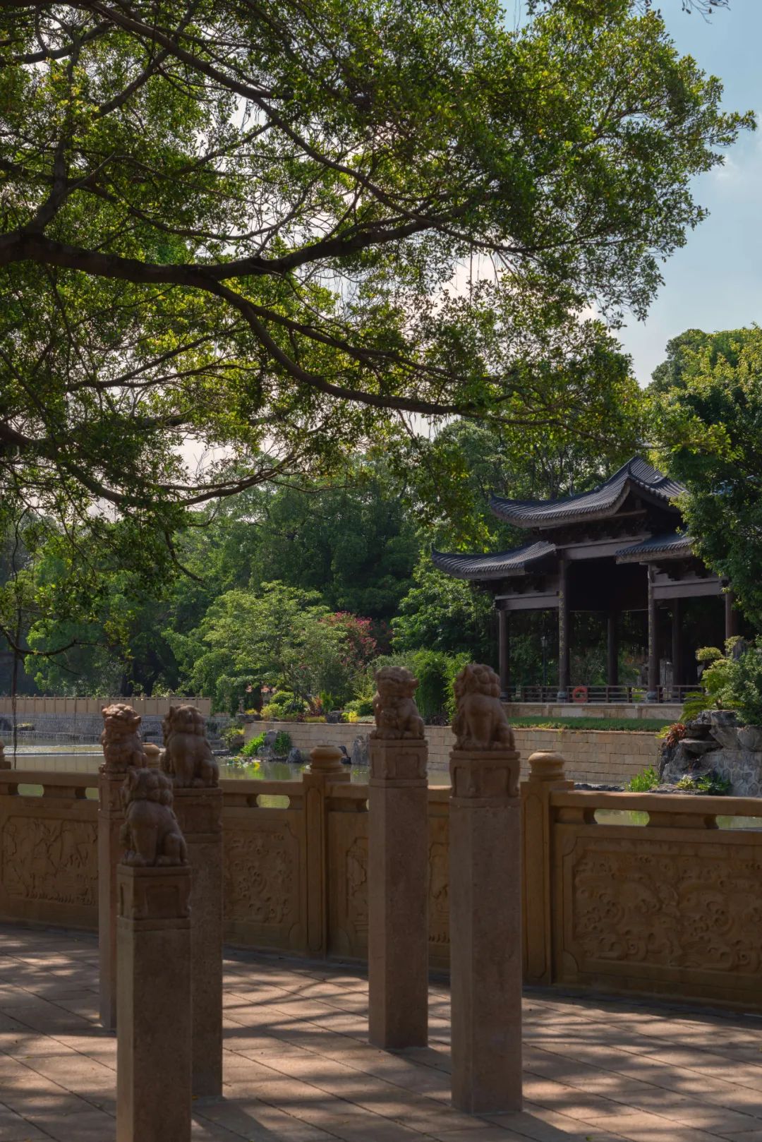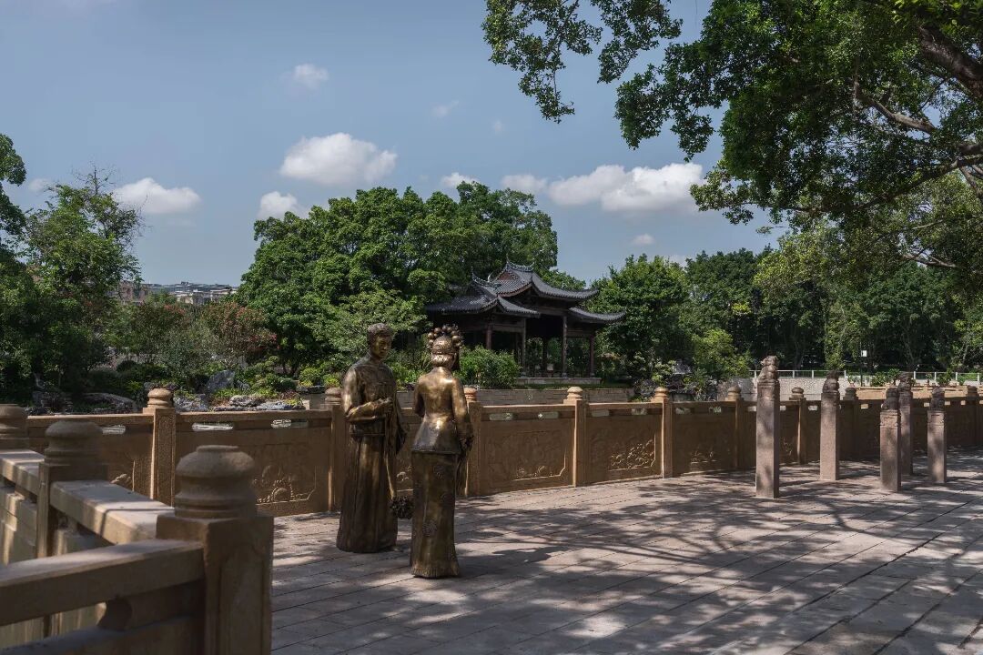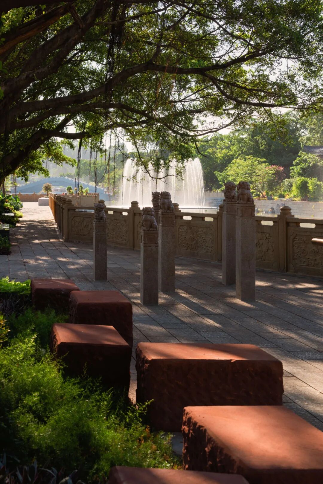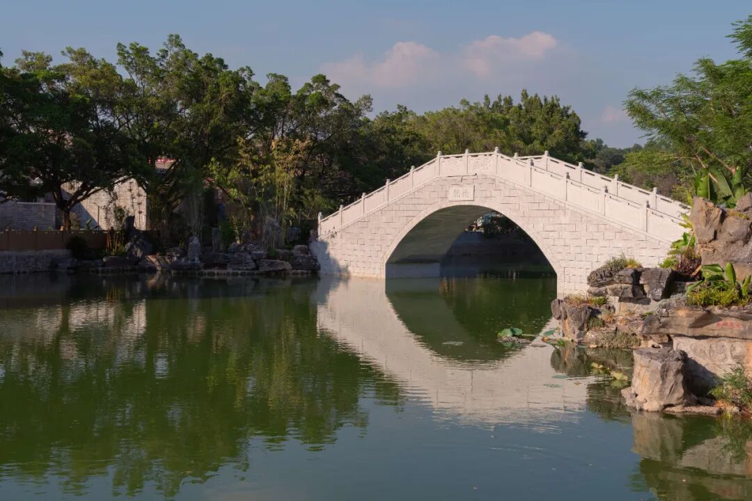 ▼走上鹊桥通往湖心岛,两边假山嶙峋,榕树掩映着粤剧大戏台;