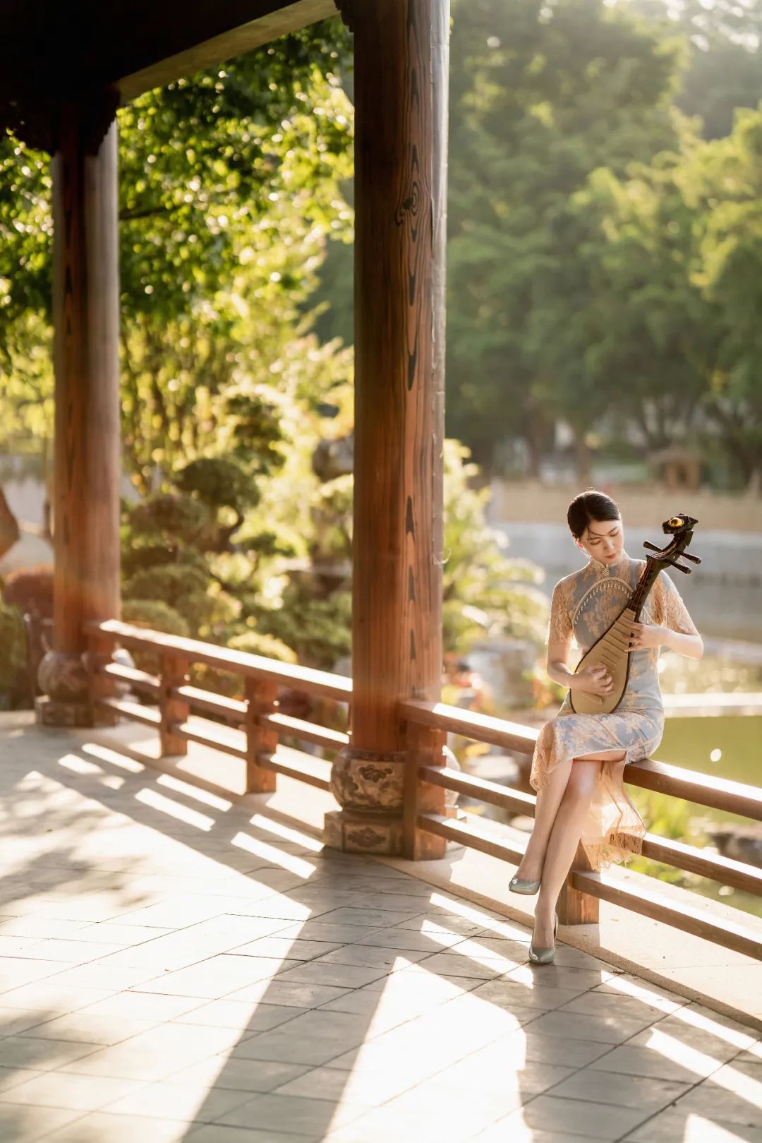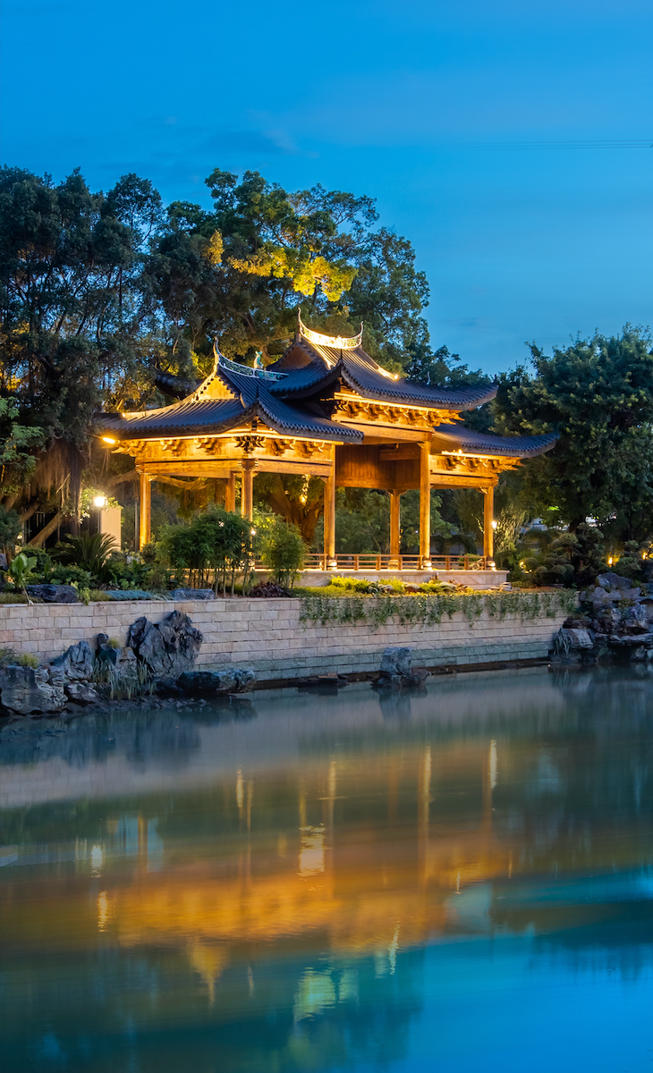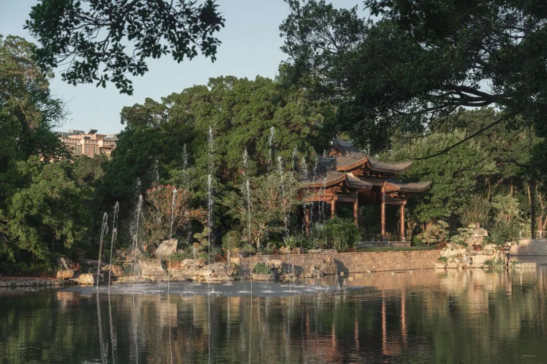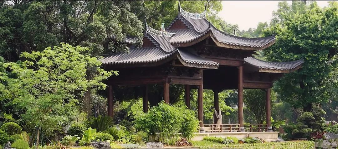 ▼走上鹊桥通往湖心岛,两边假山嶙峋,榕树掩映着粤剧大戏台;