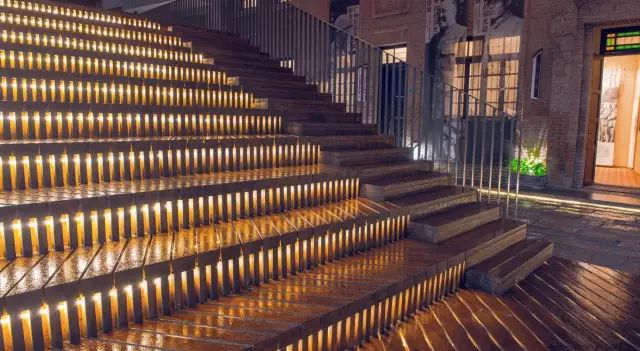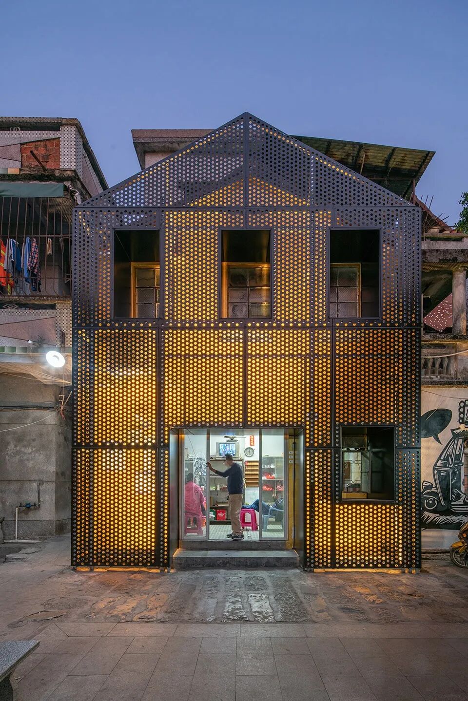 ▼夜晚灯光透过穿孔铝板立面,形成戏剧化的效果