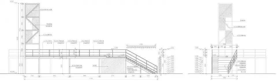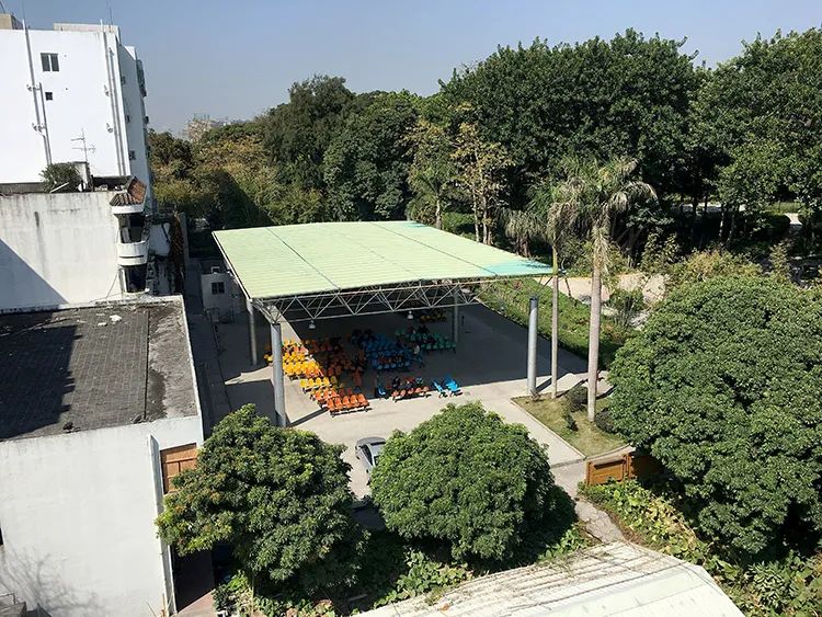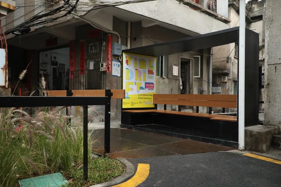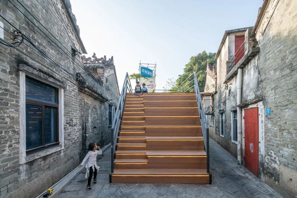 在戏台附近有一处建筑废墟,长期荒废变成了杂草丛生的空地,有居民在此种菜。建筑师利用废墟边的公共厕所屋顶,顺势设计了一个空中廊桥系统,包括大台阶、空中栈道、脚手架海报塔等,让人们可以走到二层标高,近距离观赏近在眼前的历史建筑群(包括两个祠堂、一个家塾、环绕周边的老建筑群)。同时,利用废墟一侧的小空地,将其改造成为室外广场,铺上木板,可以坐在此处休息,也可以从事小型交往、休闲、聚会、体育活动(比如在此练习螳螂拳)。