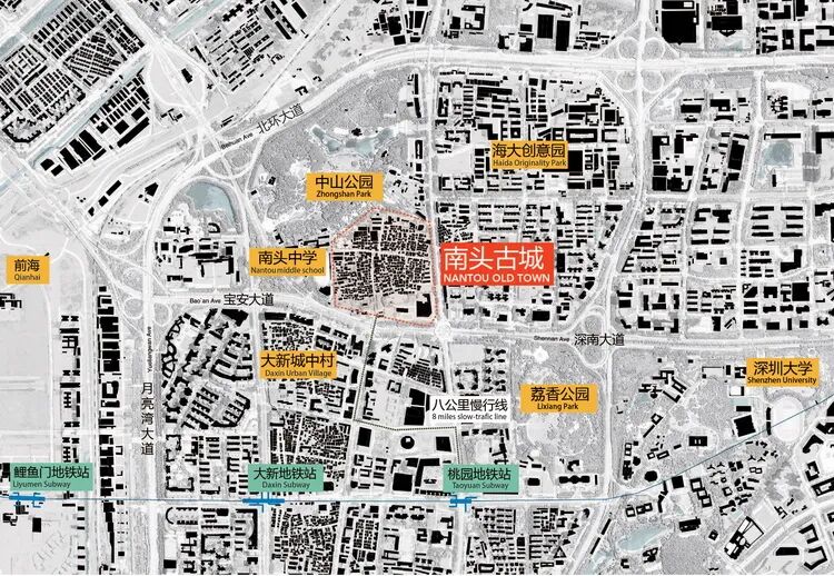 南头古城保护与利用项目,位于广东省深圳市南山区南头街道、南头古城内。项目同时面对历史遗产保护与旧城(城中村)改造的矛盾命题,自2016年开始集中进行更新探索,前后经历了两次大的更新改造计划,最终定位于“粤东首府、港澳源头”,旨在打造具有历史人文底蕴的特色街区,及商业、办公、居住、文化为一体的活力社区。