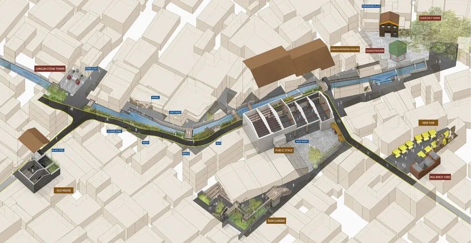 道路剪裁之后,“裁直剪曲”无形中增加了很多边角余料空间,可以用于景观绿化、观赏休憩。设计了一些悬挑花池、美人靠座椅、过河小桥,丰富沿岸景观。进一步,将岸边新增边角余料空间的标高降低之地面以下,从视觉上拓宽了河道宽度。