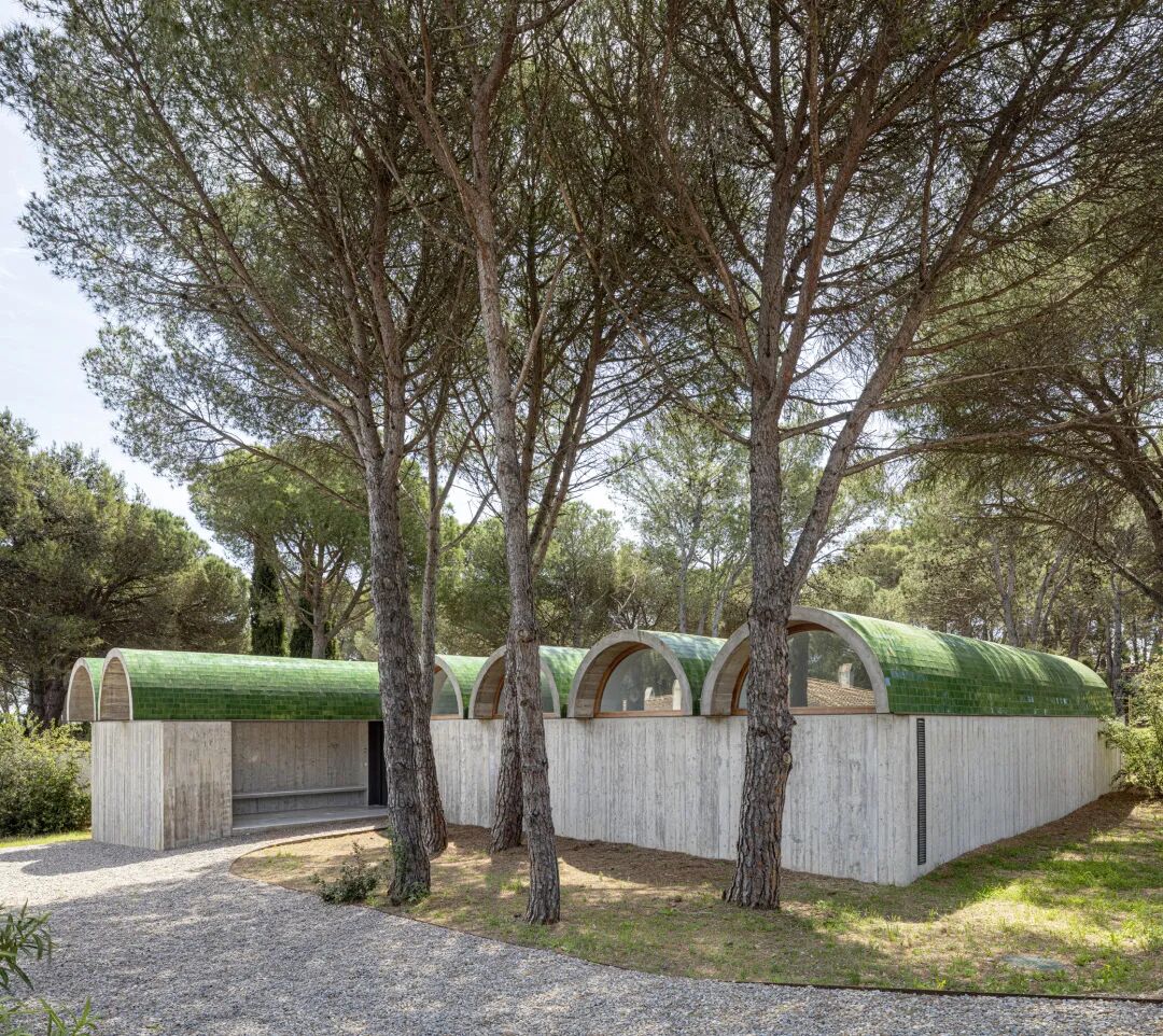 建筑的屋顶是由绿色玻璃瓷砖制成的,带纹理的钢筋混凝土墙高2.1米,支撑着一排排悬臂式拱形屋顶墙壁从室内延伸至室外,形成了两个不同尺度的庭院,将住宅与街道分隔开来,保护了庭院与住宅内的隐私。
