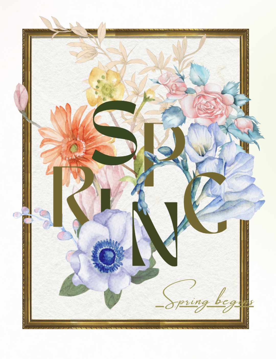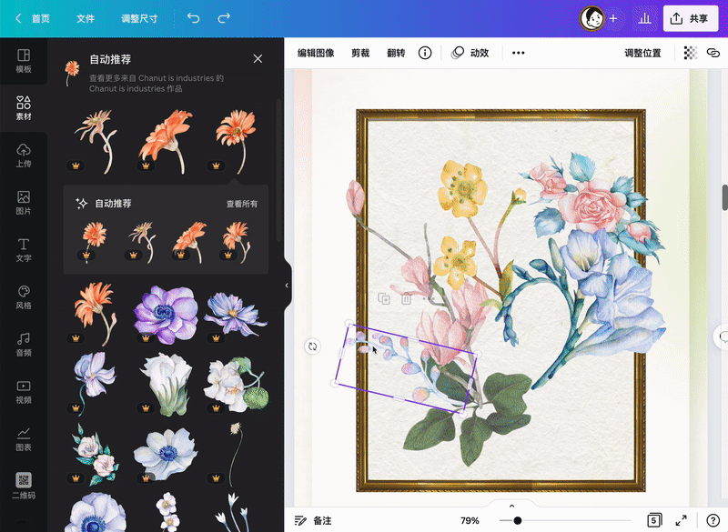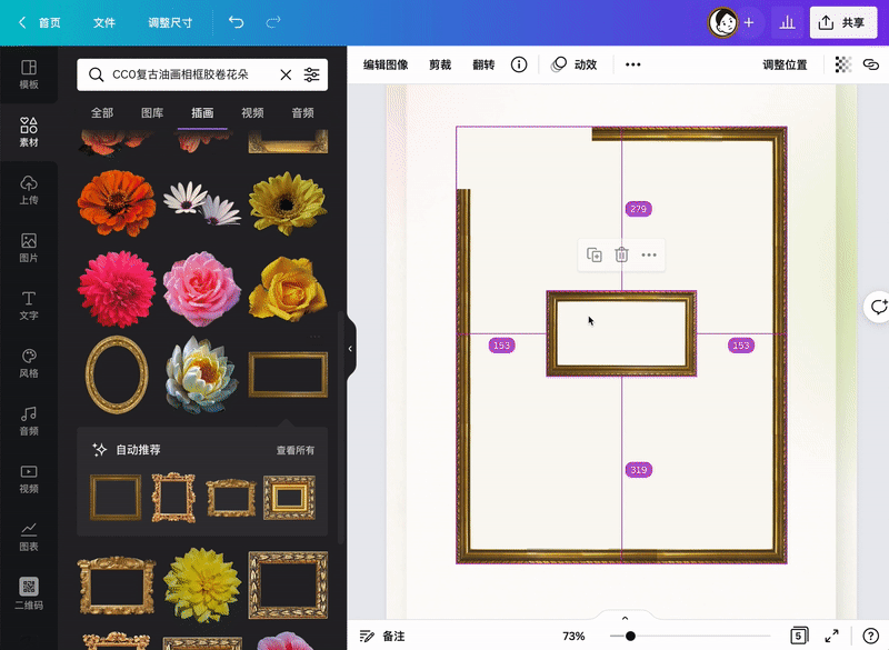 将需要用到的花朵素材和文字都放入相框内,并摆放好,部分花朵素材可以超出相框。