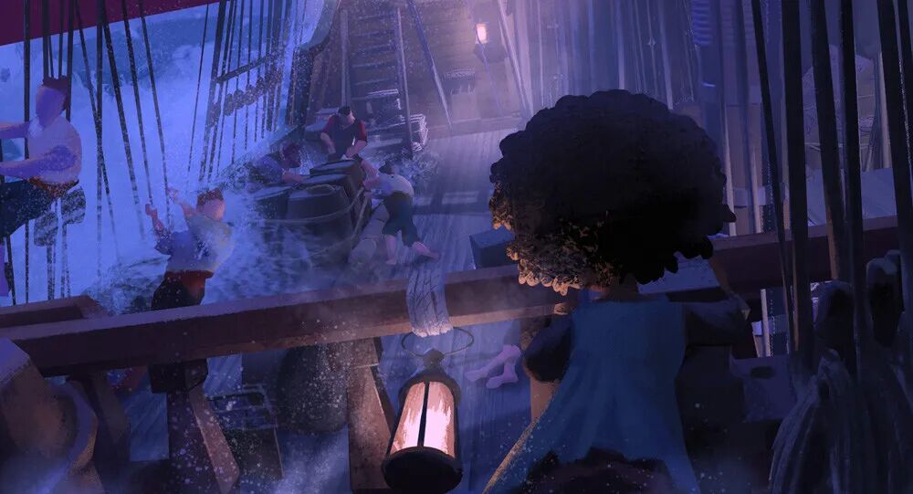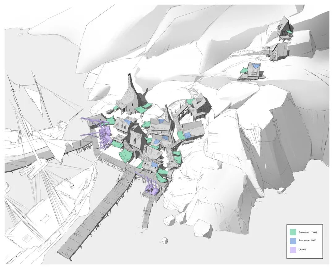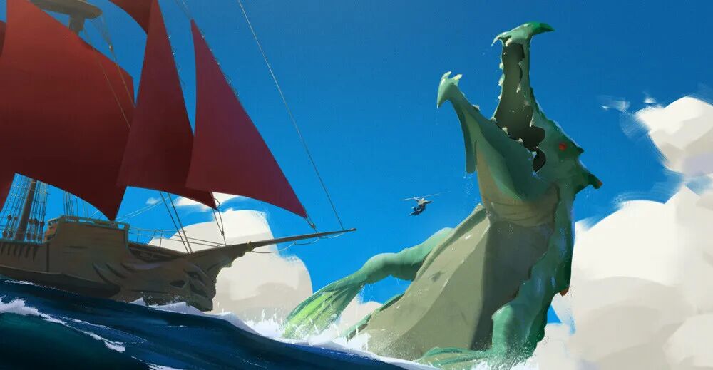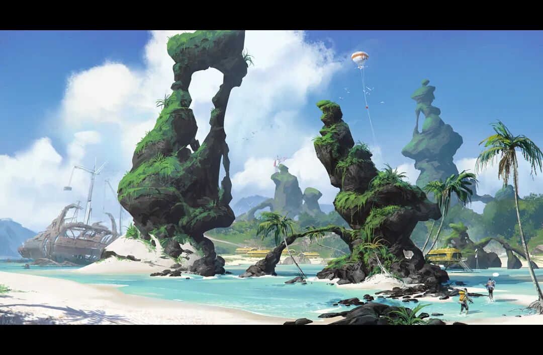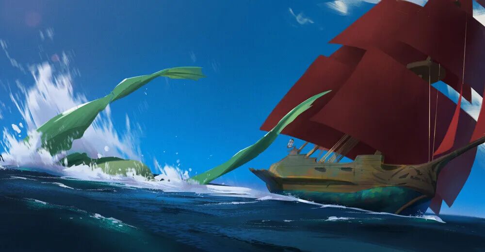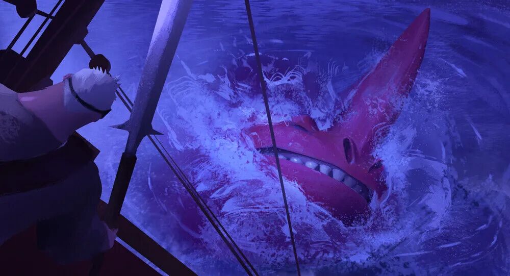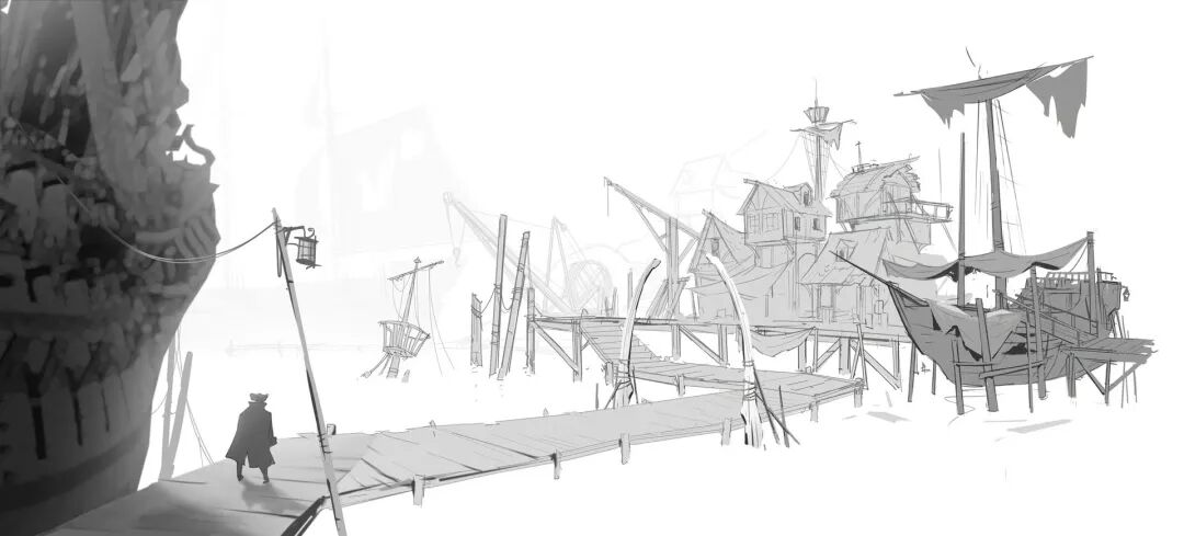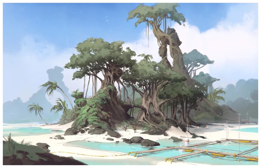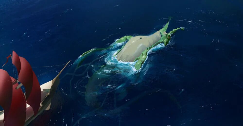 他的作品色彩和光影运用非常惊艳,比如Srodawa为最近上映的Netflix电影《海兽猎人》所创作的概念设定,不仅在颜色搭配、整体构图方面出彩,故事感和氛围感也很强。
