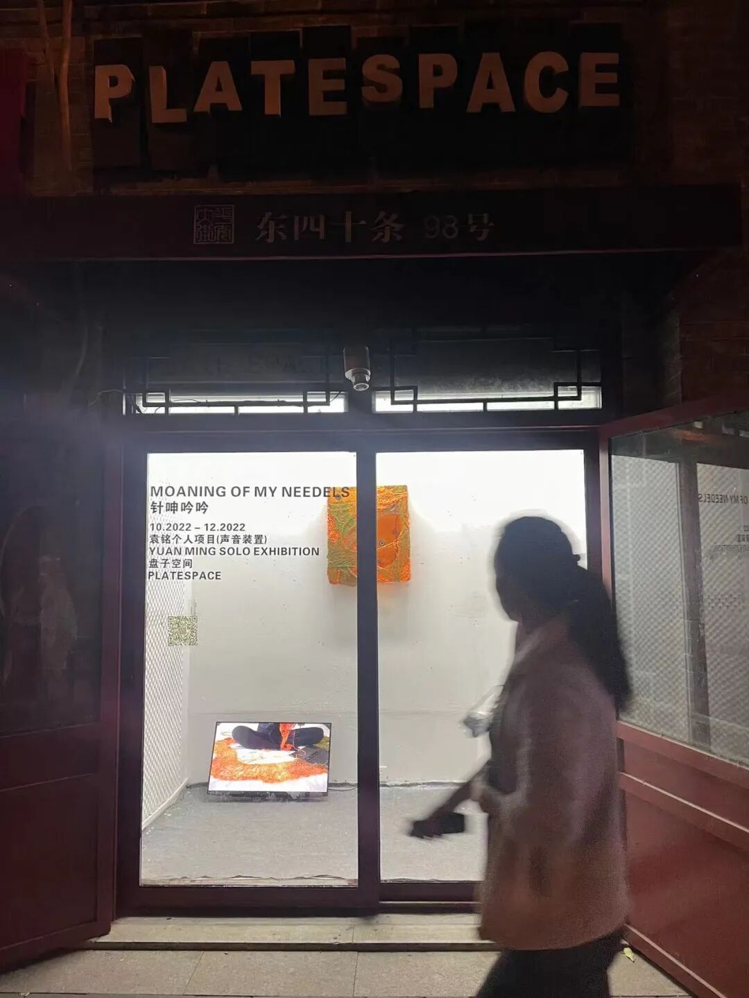 盘子空间位于东四十条的艺术橱窗自2019年成立以来,已经举办了几十场展览。目前正在举办袁铭个人展览,艺术家用连接到电脑的金属纺针,即兴编织一件覆盖自制音箱的海马毛编织物。在这一项目中,表演创造了声音和艺术品的实体,同时也是艺术项目的一个重要部分。