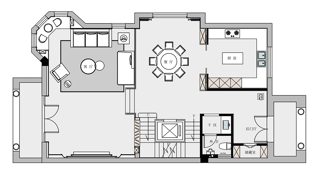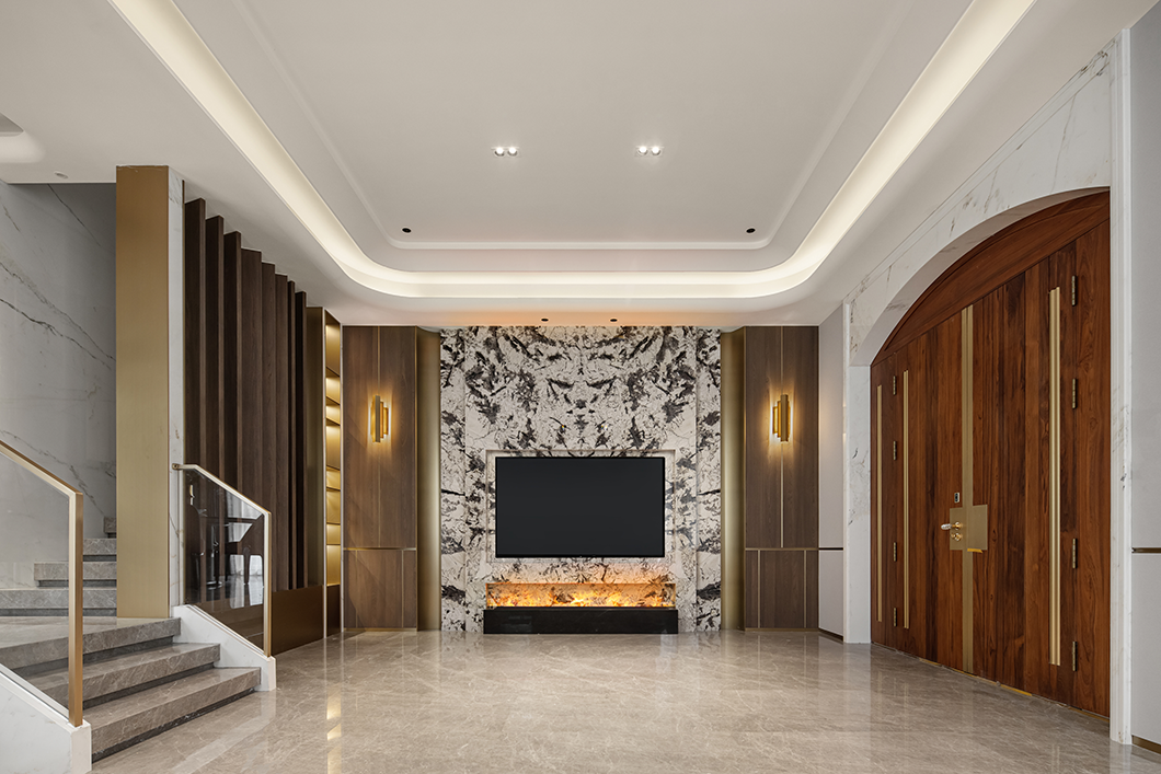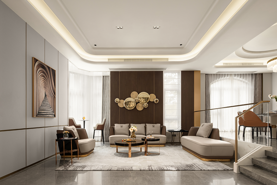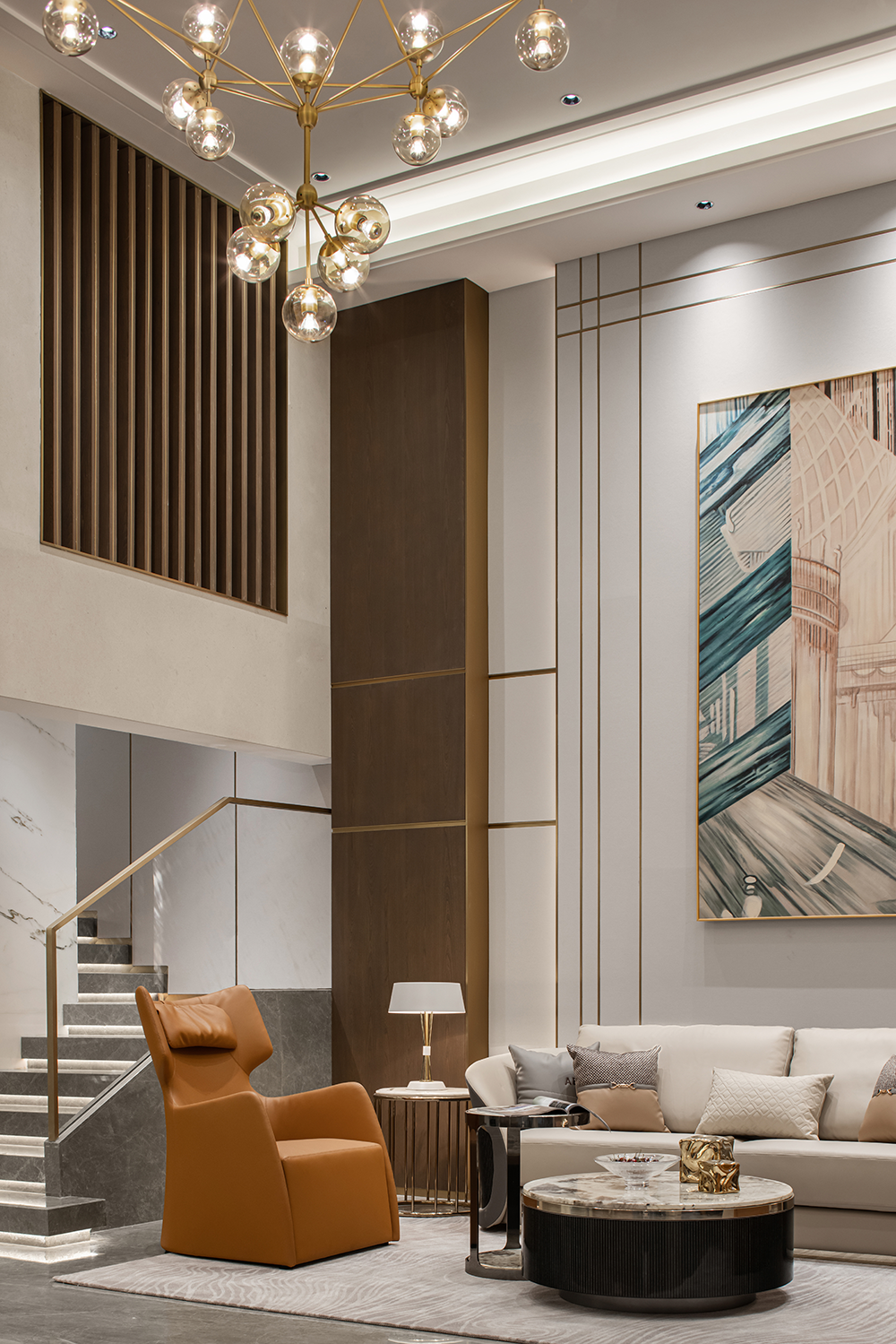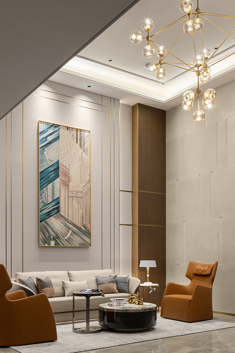 客厅独有的社交属性使它赋予与众不同的空间魅力,它是整个建筑的开场白,也是一段完整的结束语,这里需要有温暖的冷静、个性的标签和成熟的浪漫等,下面开启本案特有生活的故事。
