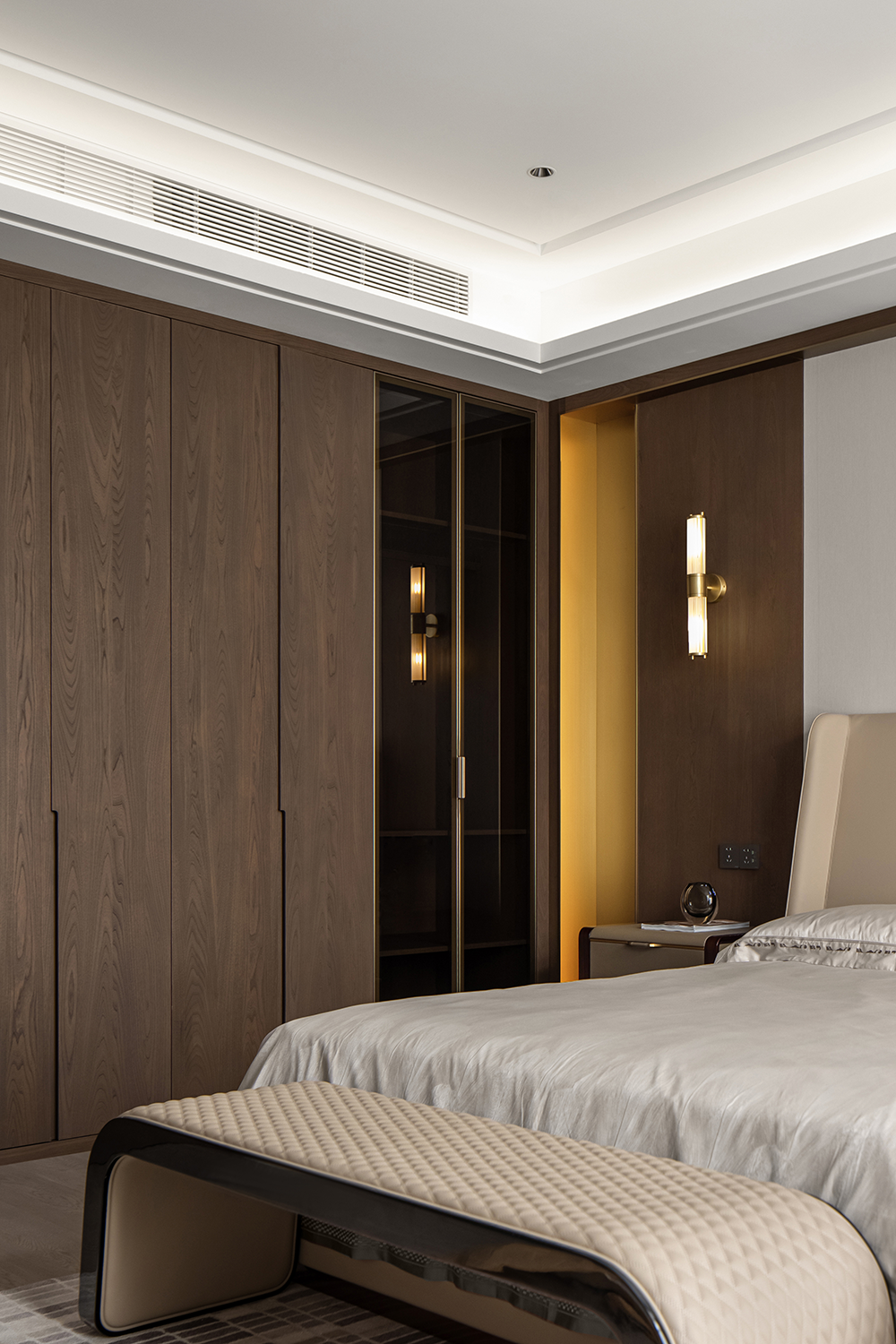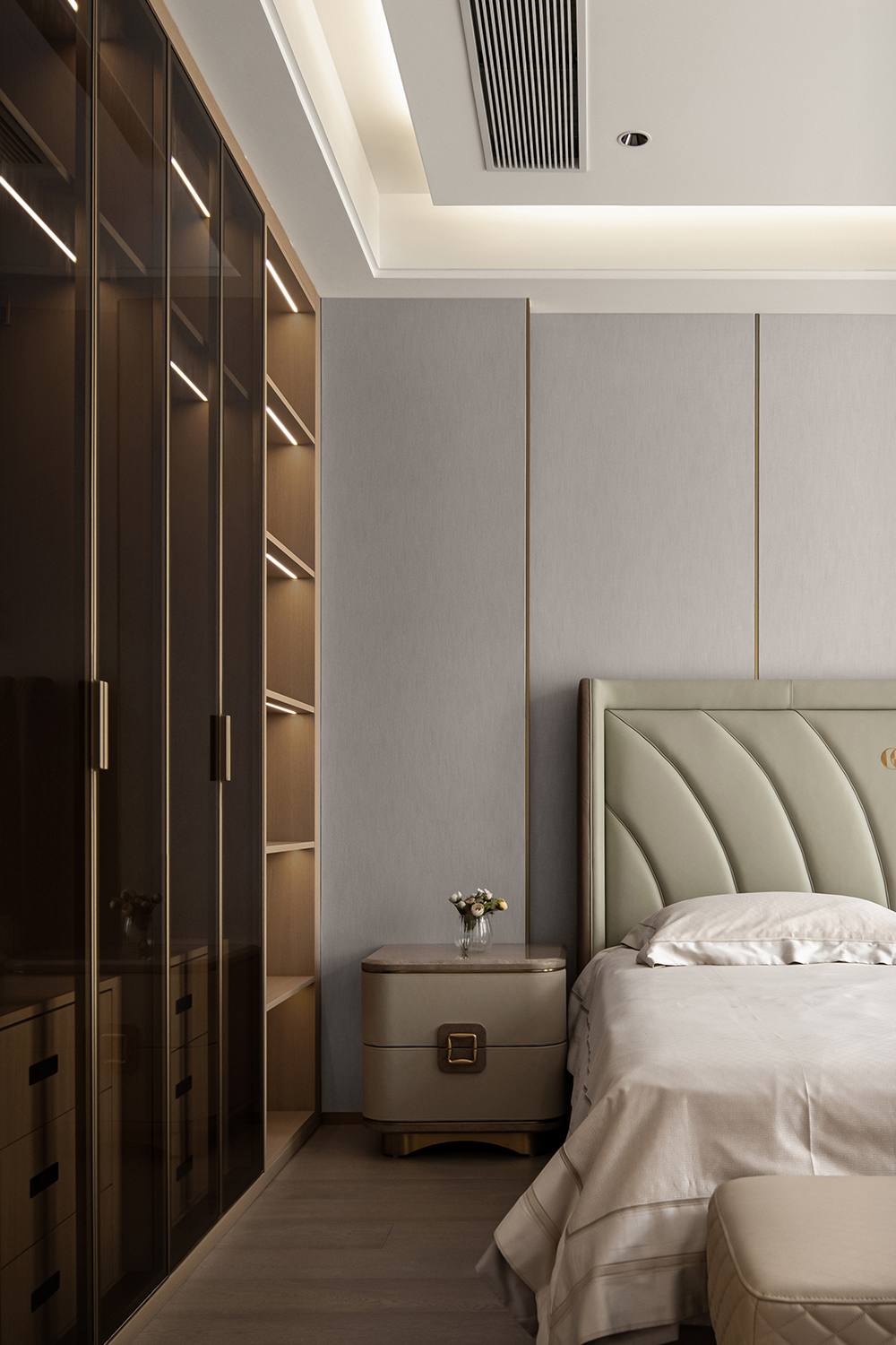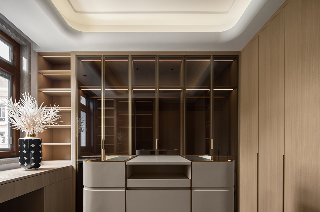 配套衣帽间是整体风格的延续,梳妆台的镜面哑光,彰显了整个台面的贵气,不同功能的收纳空间采用统一镜片处理,不规则而层层叠叠的效果呈现更为精致。