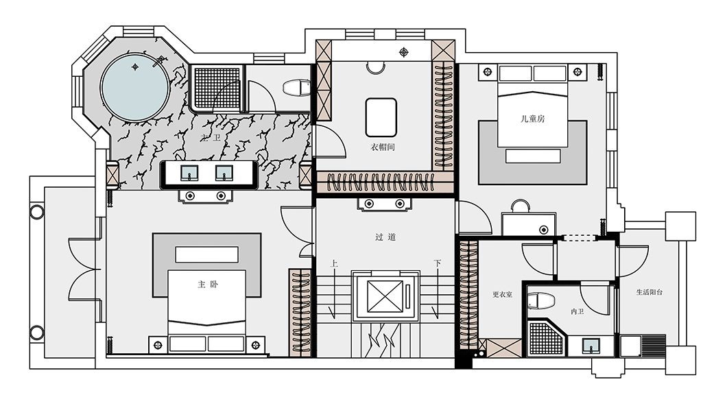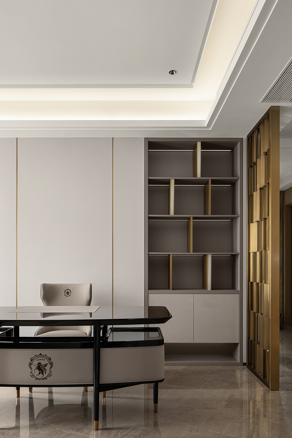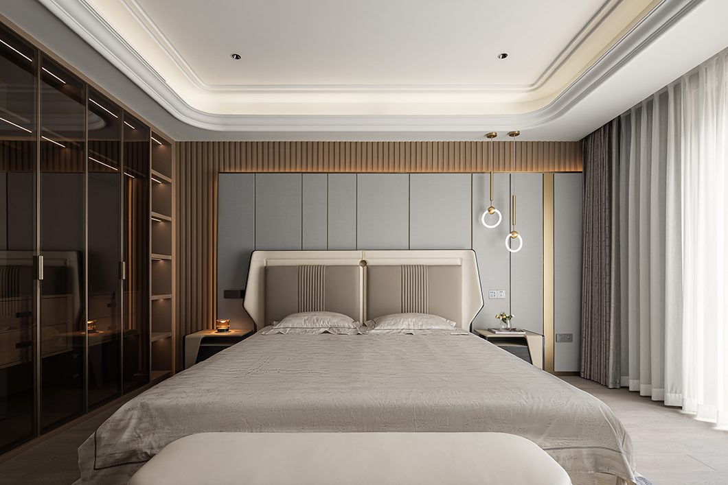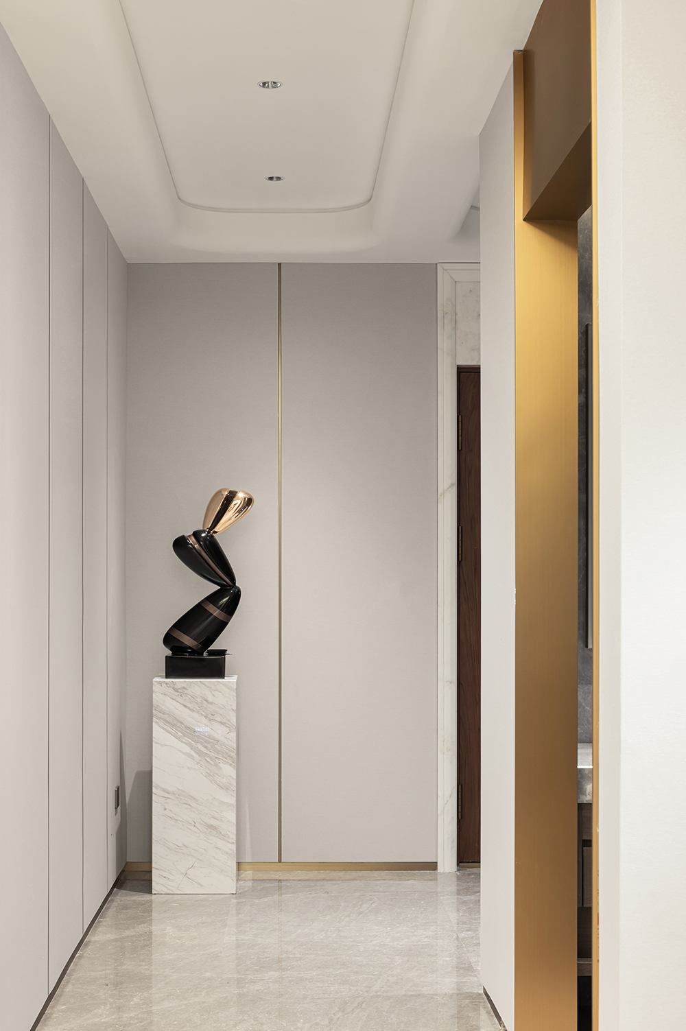 配套衣帽间是整体风格的延续,梳妆台的镜面哑光,彰显了整个台面的贵气,不同功能的收纳空间采用统一镜片处理,不规则而层层叠叠的效果呈现更为精致。