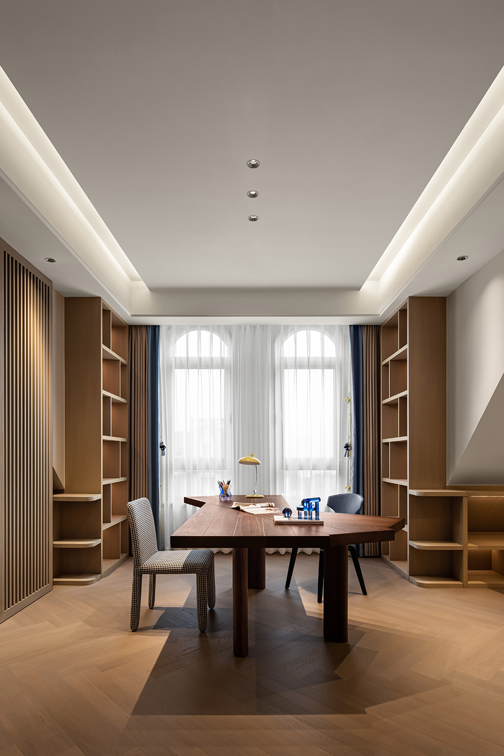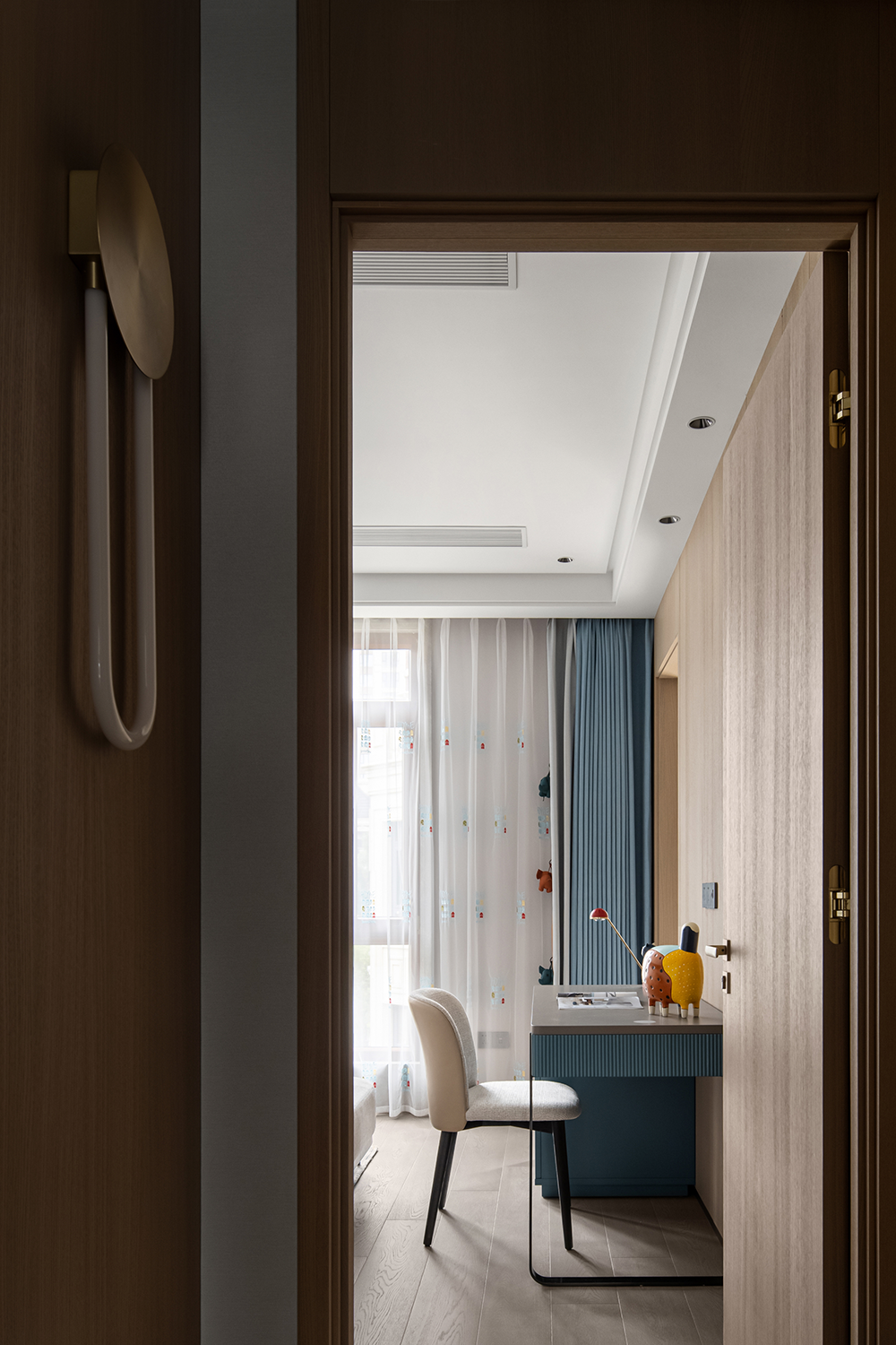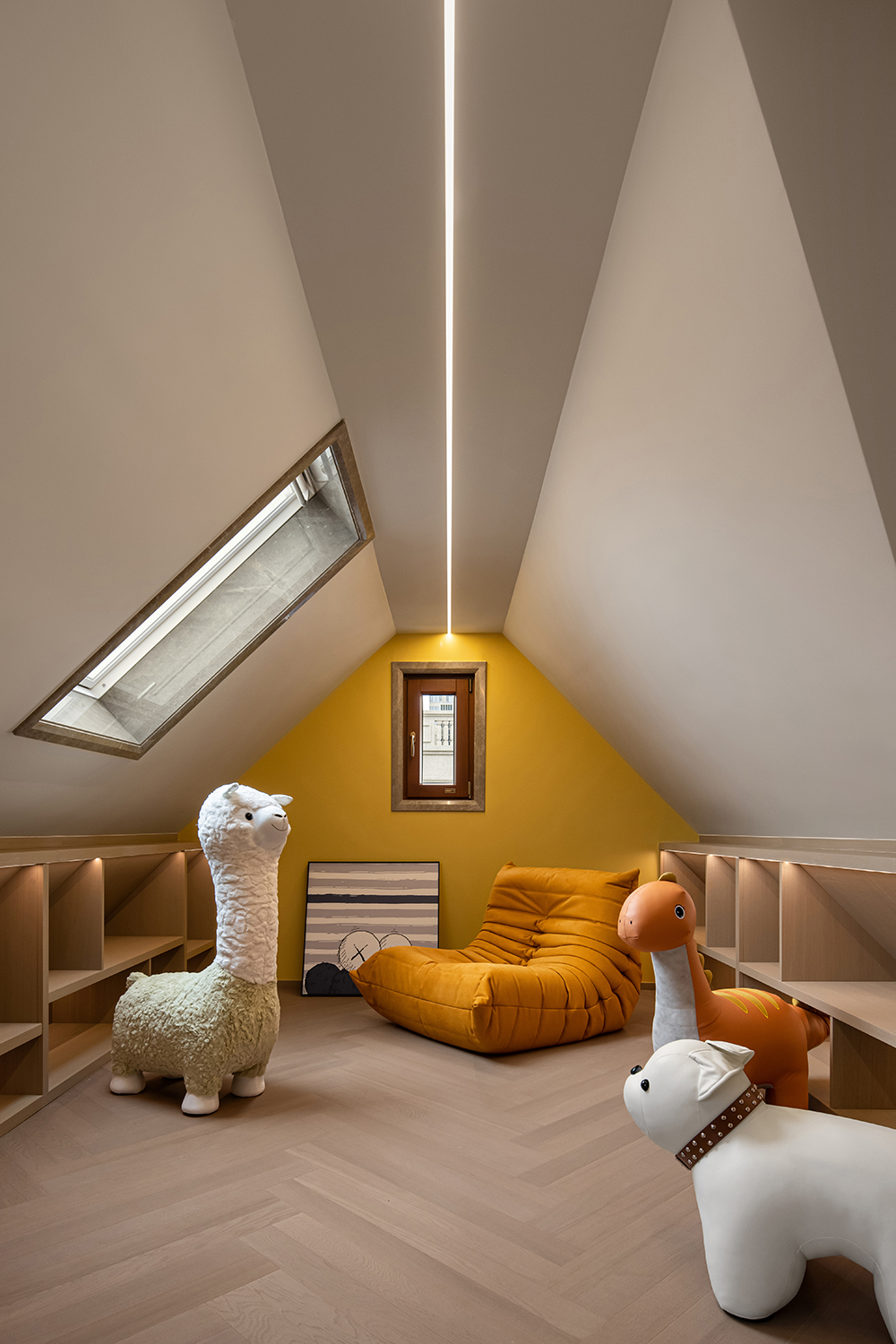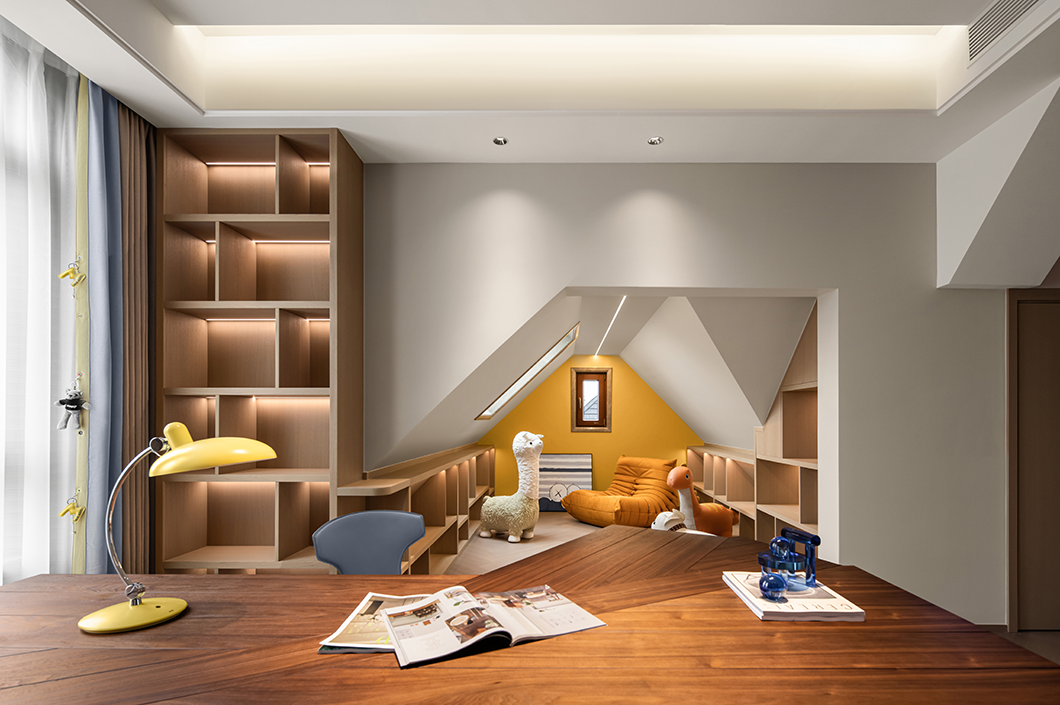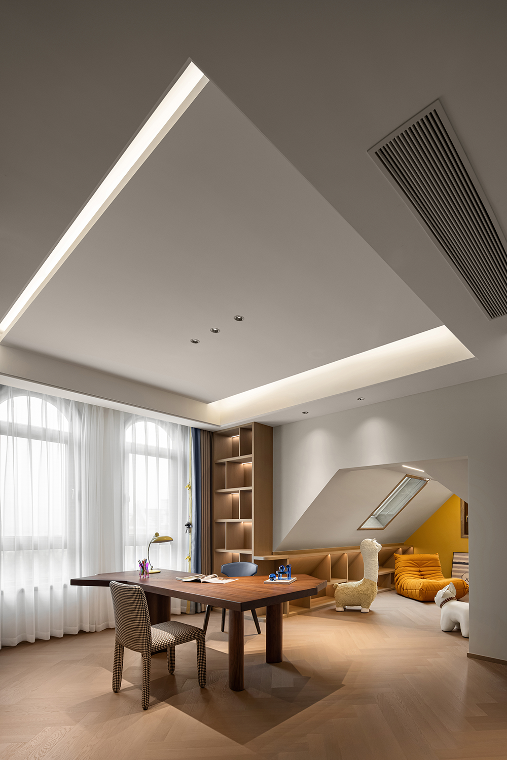 在灯光的运用上,设计将天顶的几何式线,演变延伸到其他空间,隐藏型的光源,使其更为柔和,茶余饭后,柔和的灯光伴着玩偶和孩子嬉闹的笑声,每的日常,就在这其乐融融的家中度过。