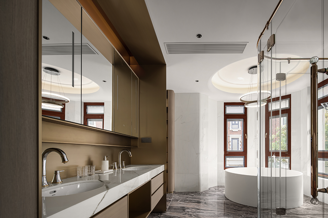 金属与玻璃和大理石搭配的洗漱台,窗框以及大理石铺装,使卫浴的画面展现出利落干净感,三面玻璃窗环绕提供了充分的光线,而干湿三区的规划,显出了沉稳与实用性。