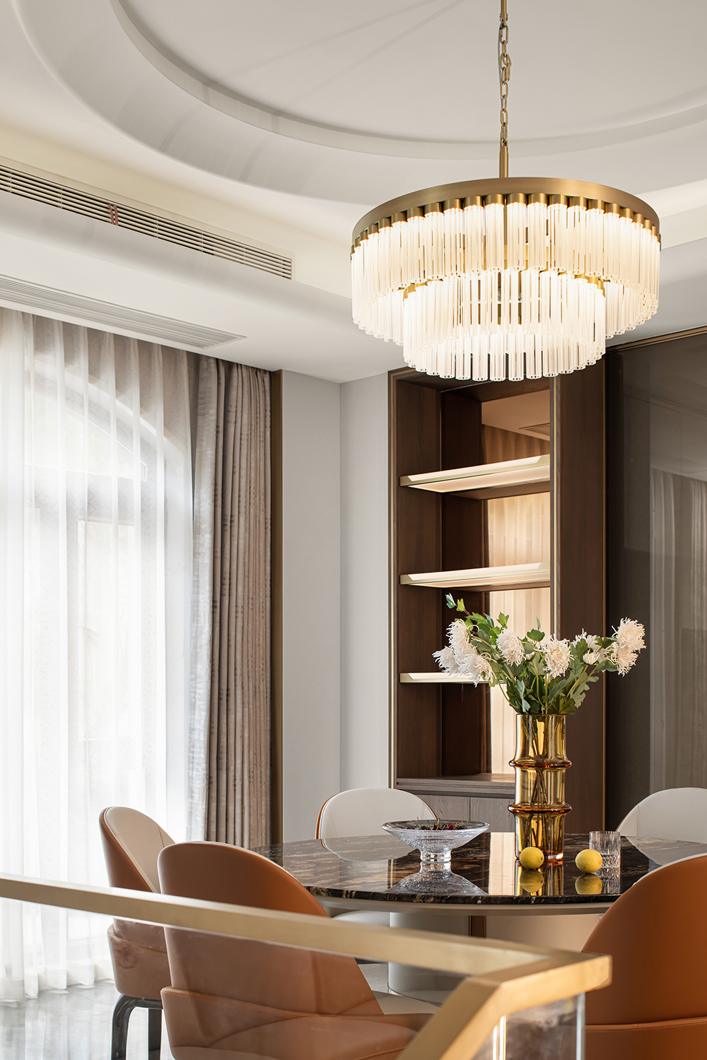 设计选取米灰、棕咖为主色调,局部采用镜面金属加深细微刻画,轻柔的窗纱送来自然光影,把空间的舒适氛围给足,而温润的灯光和不同的家居材质交相映辉煌,生出客厅层次的美感。