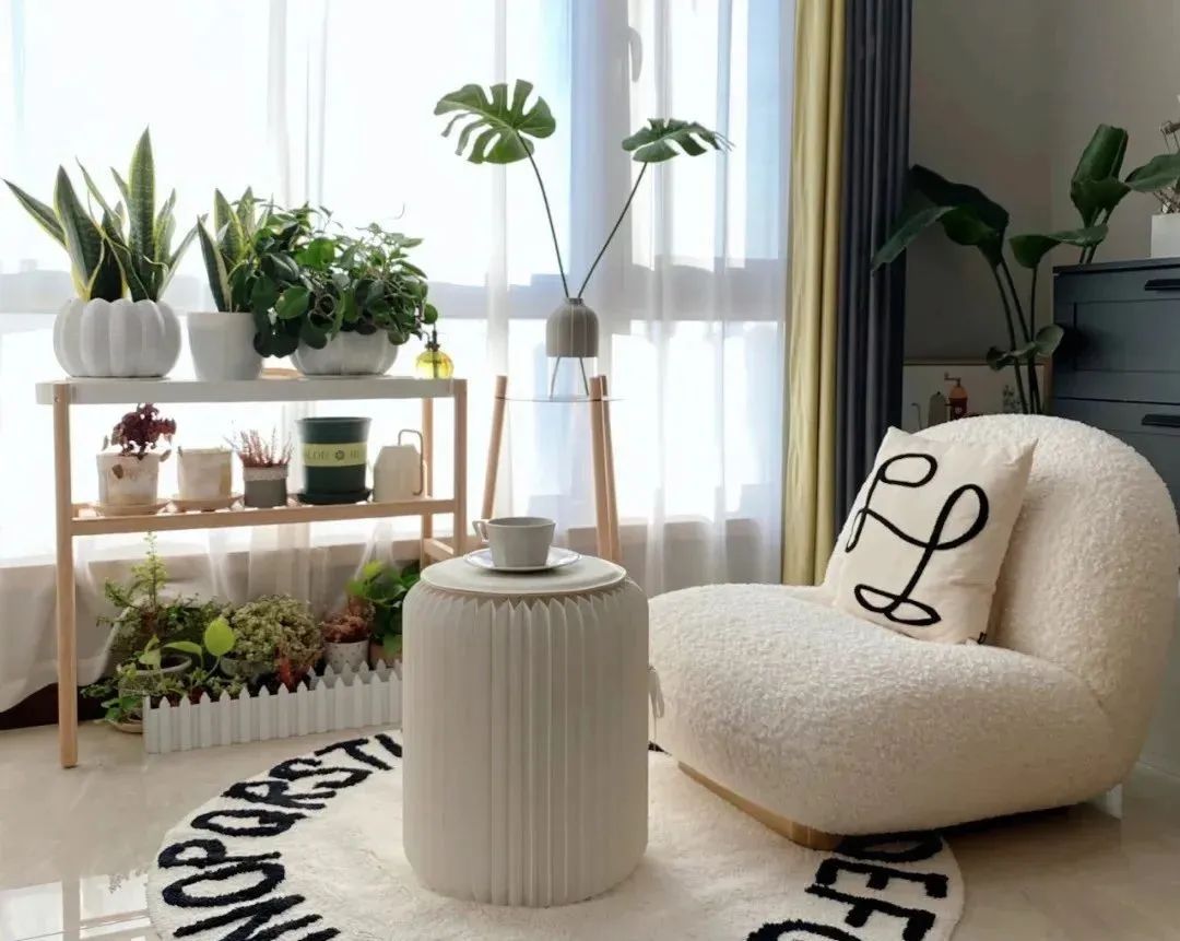 阳台被打造成了多功能区,地上摆放了一张饱满圆润的懒人小白椅,坐感超级柔软舒适,颜值也很高,搭配同色系的地毯、折叠凳,妥妥的ins风,给人一种很温柔的感觉,平时光着脚丫坐在上面喝喝茶或看看书,简直不要太惬意,旁边还有一个花架,种上几盆绿色植物,不仅给家里增添了生机和活力,看着也养眼。