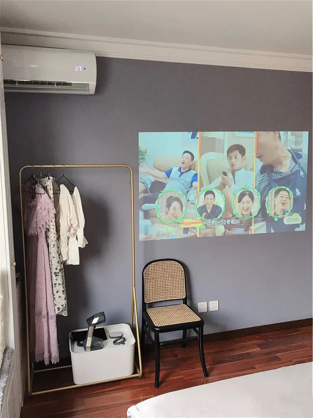卧室还装了投影仪,以原墙为背景,没有投影幕布,画面也很清晰,周末窝在床上看电影,不要太享受,墙角放了一个黄铜衣架,非常简约精致,还不占地方,专门用来挂熨烫的衣服或者第二天要穿的衣服,拿放方便,不用特意打开柜门找。