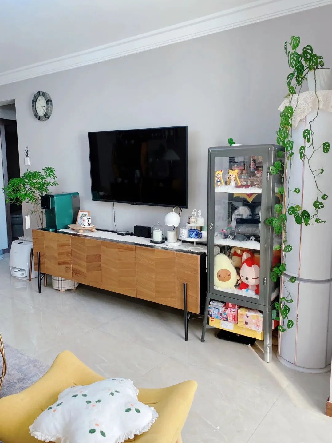 电视墙也没有做任何装饰和造型,以灰色墙为背景,十分简单耐看,为后期更换风格提供了更多发挥的空间。