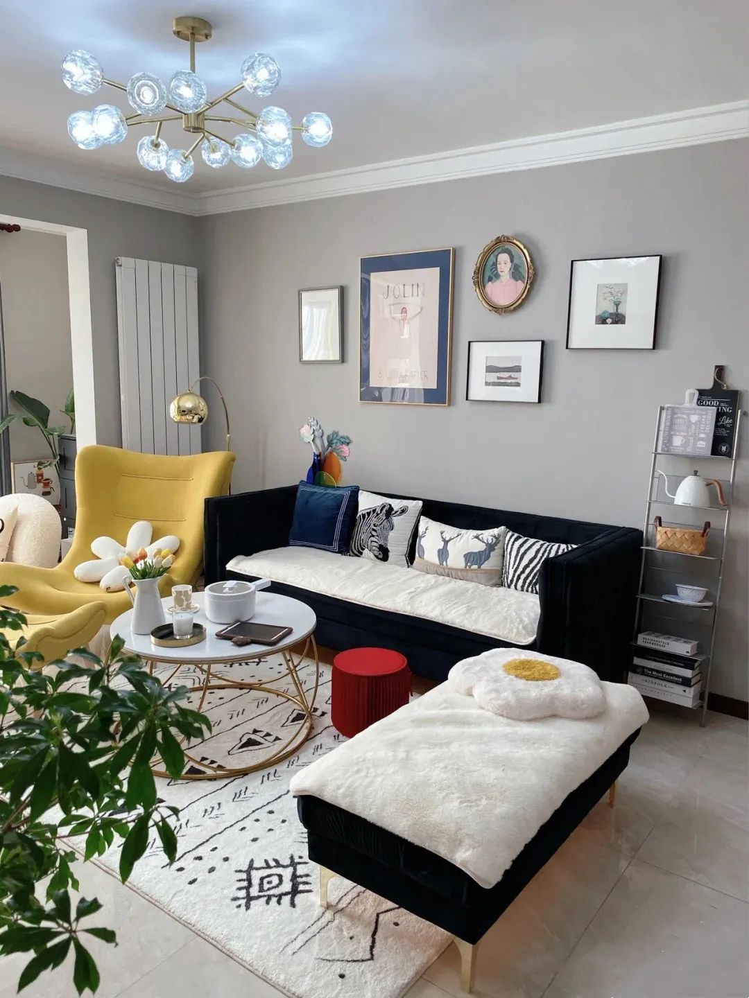 黑色的丝绒沙发给人一种大气优雅的感觉,搭配白色的毛绒毯和米色地毯,又多了一些温柔气质,旁边的黄色蜗牛椅,色彩鲜亮,为家里增加一丝活泼温暖,全铜水晶分子灯可以说是客厅的点睛之笔,轻奢精致有格调,美极了,整体效果好看到闪闪发光。