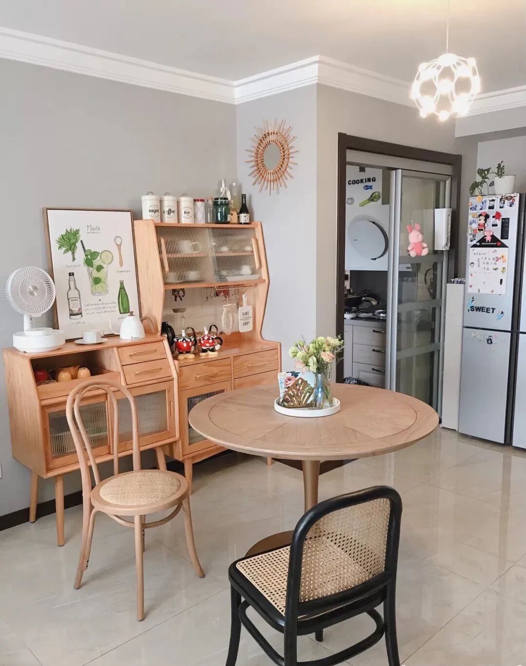 利用墙壁转角安装了一组餐边柜,位置刚好,不会影响过道空间,樱桃木材质自然清雅又显质感,高低组合设计,加上一旁的置物架和墙面隔板,拥有超强储物容量,各种餐具碗碟、酒水饮料和瓶瓶罐罐都有存放之处,看着家里被这些小物件一点一点填满,越来越有烟火气。