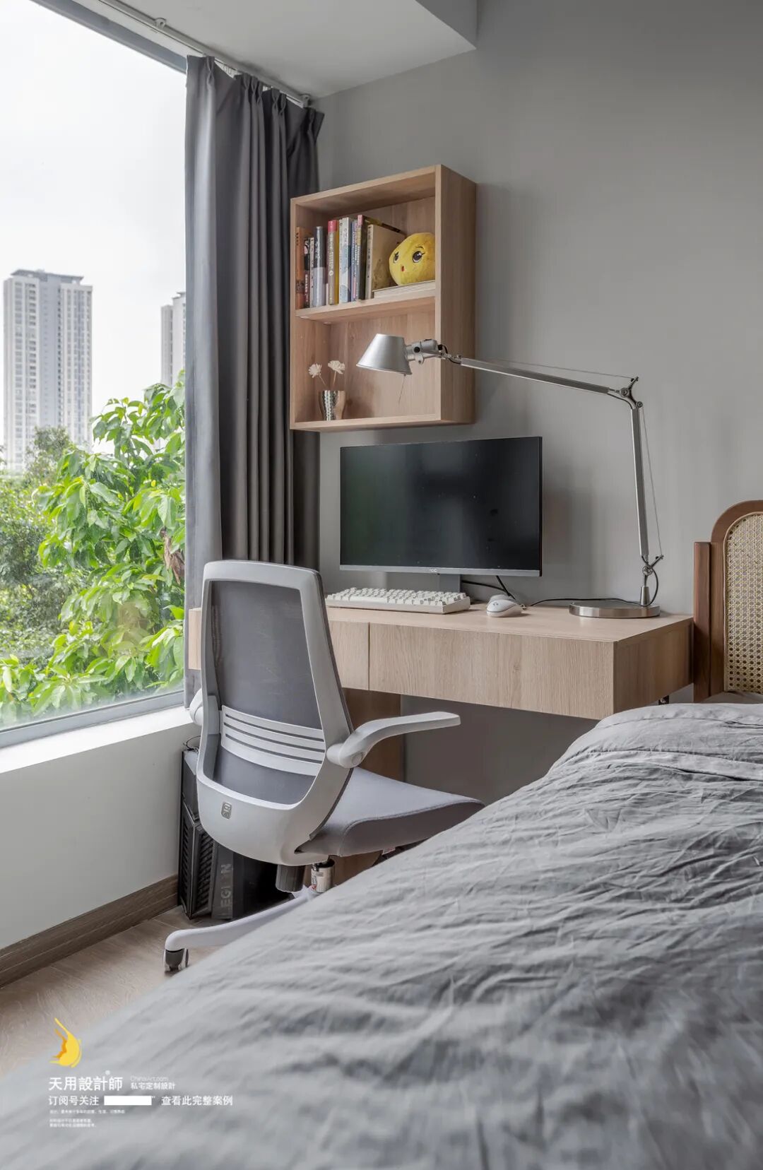 天用设计:工作区在卧室一侧,光线优秀、视野良好,工作累了可以看看风景,或者躺下来休息休息。