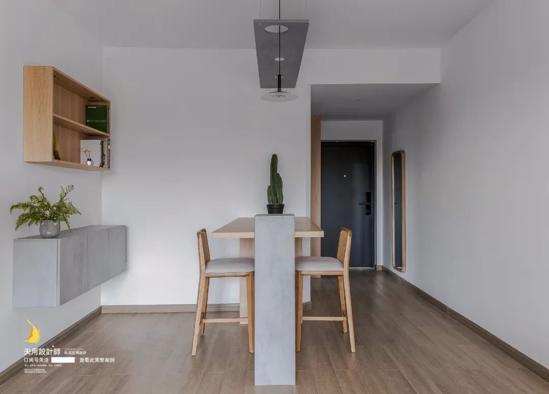 天用设计:用吧台的形式做餐厅,一方面是可以节省空间,一个人居住700mm的宽度足够使用;另一方面是出于空间的通透性和整体性考虑。