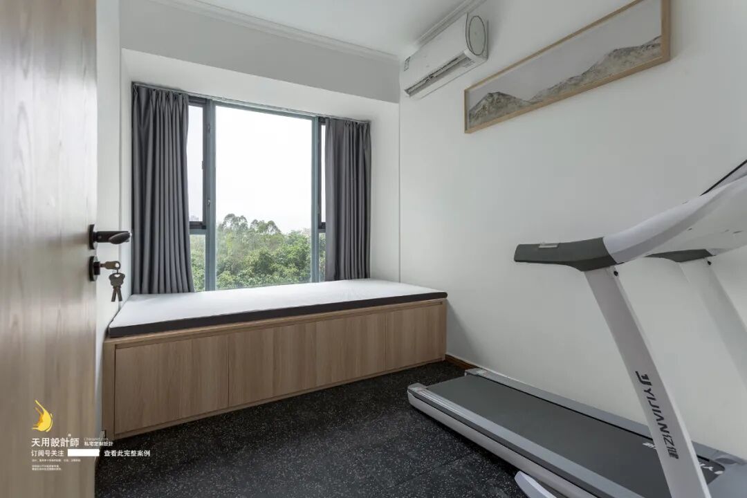 天用设计:次卧是榻榻米床,高度跟原飘窗一致,外侧是抽拉式设计,空间利用更充分,使用上也更方便。业主喜爱运动,因此次卧也作为健身房,让业主在家也能随时运动。