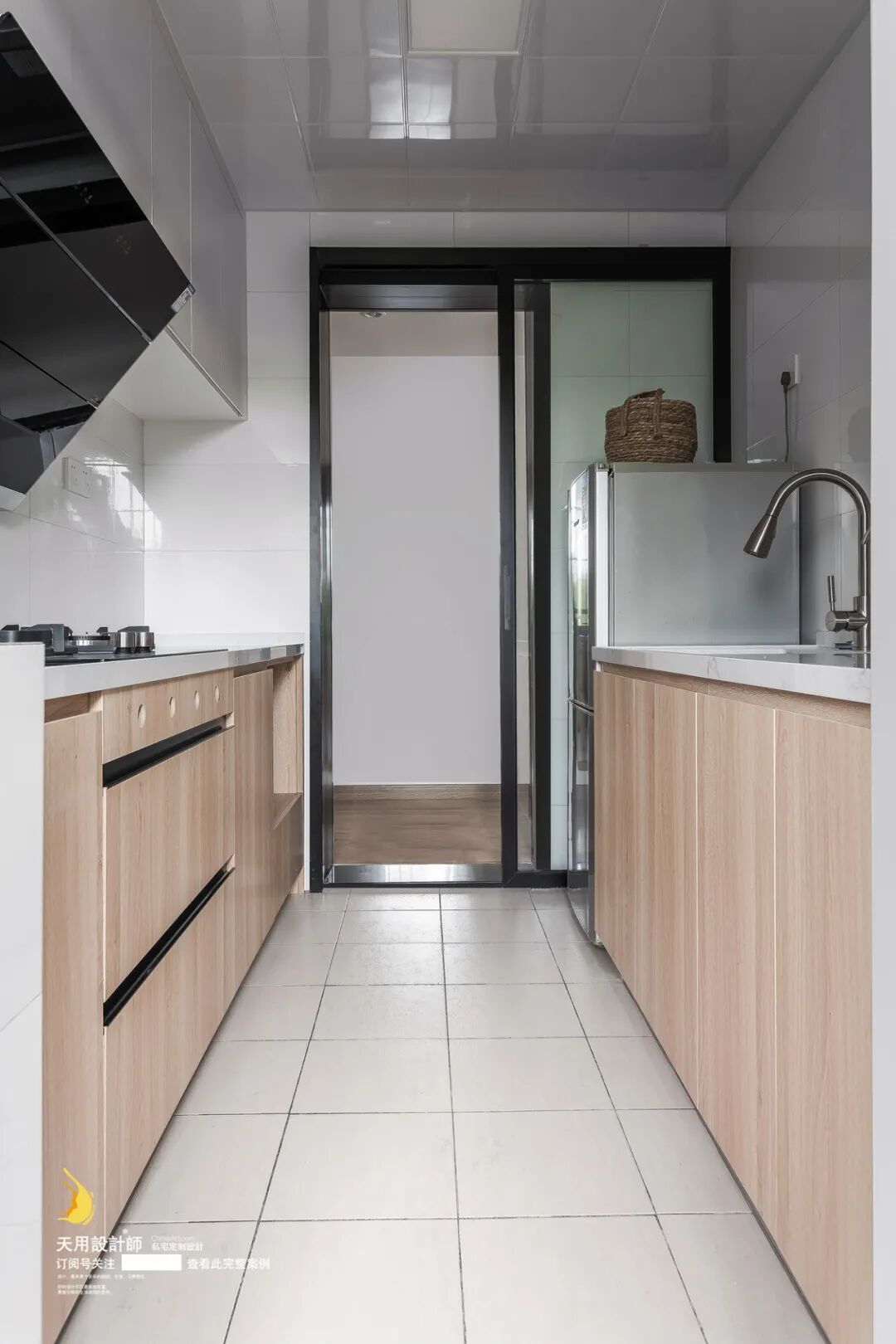 天用设计:厨房直通阳台,将水槽和灶台分在两边操作台上,作“| |”型布局,虽打断了台面的连续性,但灵活性更胜一筹。