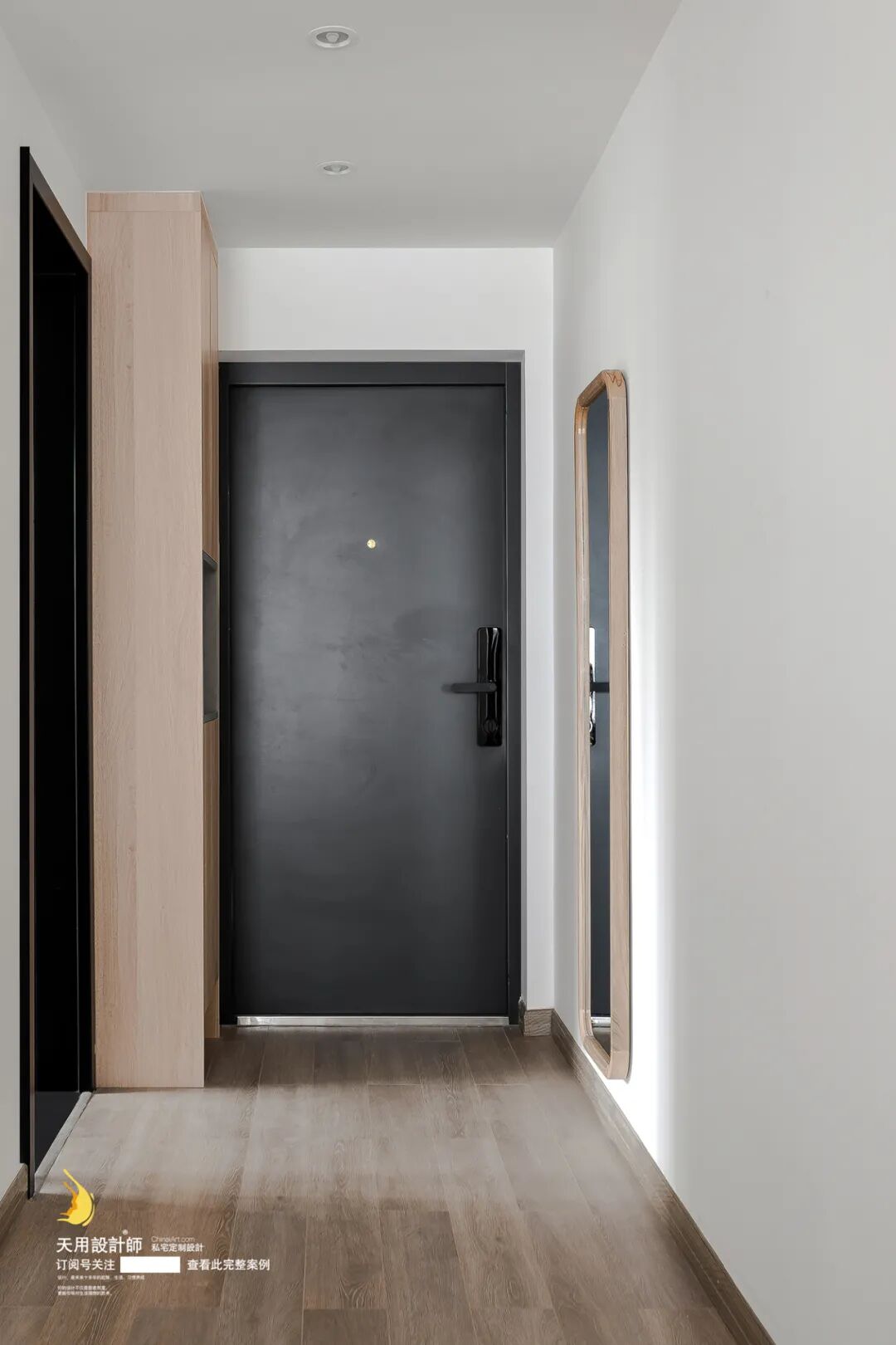天用设计:玄关是朴素简单的,鞋柜+全身镜实现玄关的基础功能,木质边框和柜面与室内其他家具达成同色成就get√。