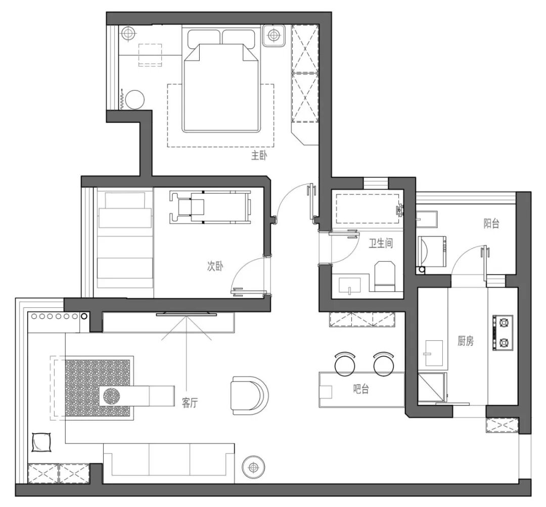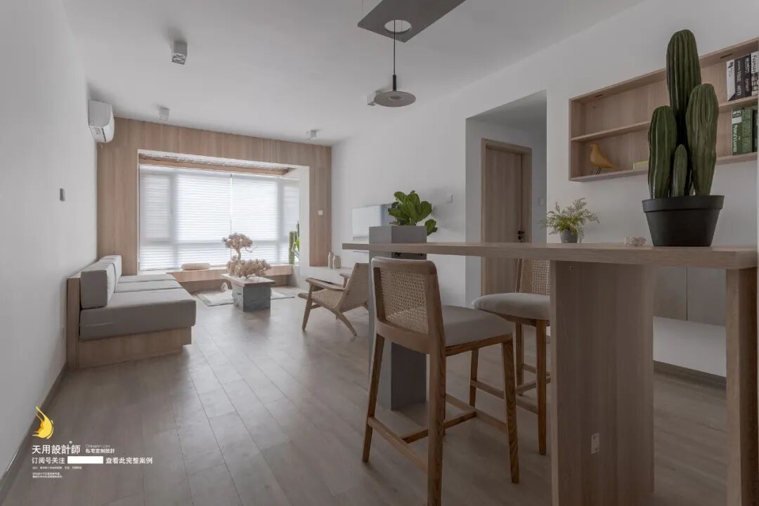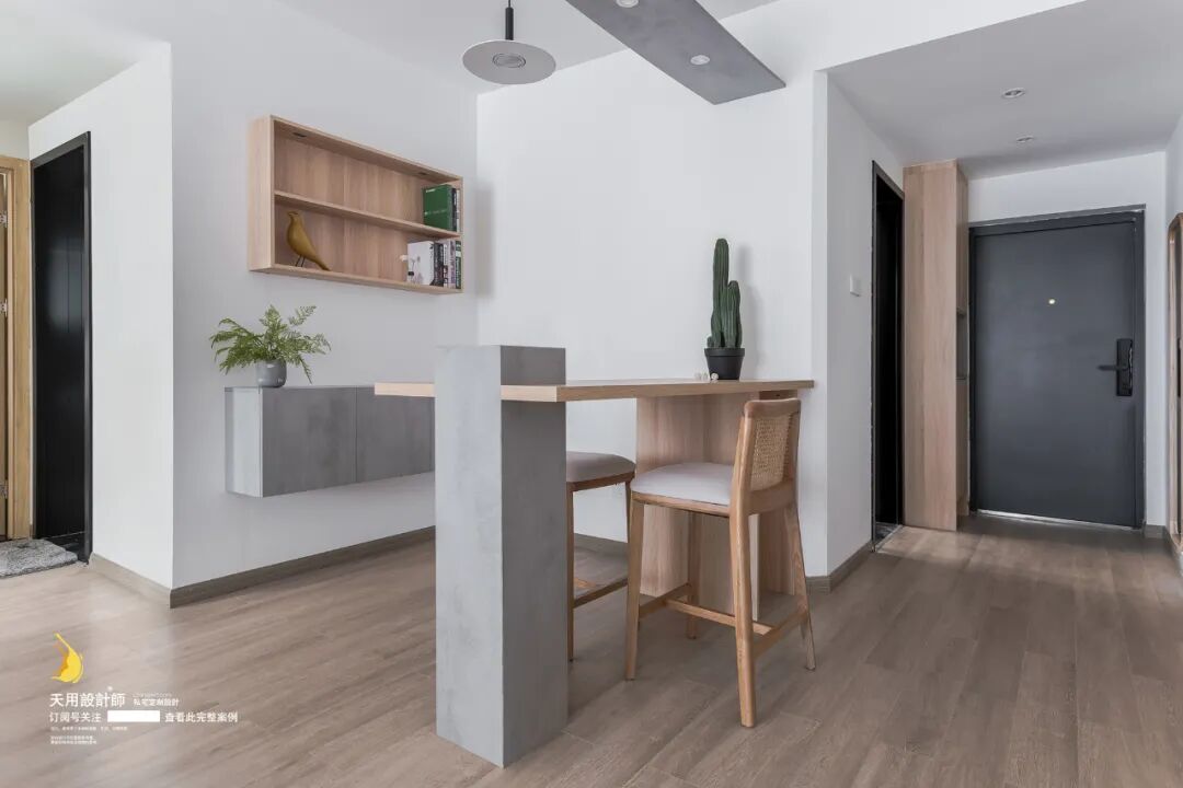 天用设计:具体功能规划时,天用团队的重点在于客餐厅的设计。一是把阳台包入室内,形成连续通透的整体;二是用吧台替代了餐厅功能,贴合业主需求并控制了使用面积。