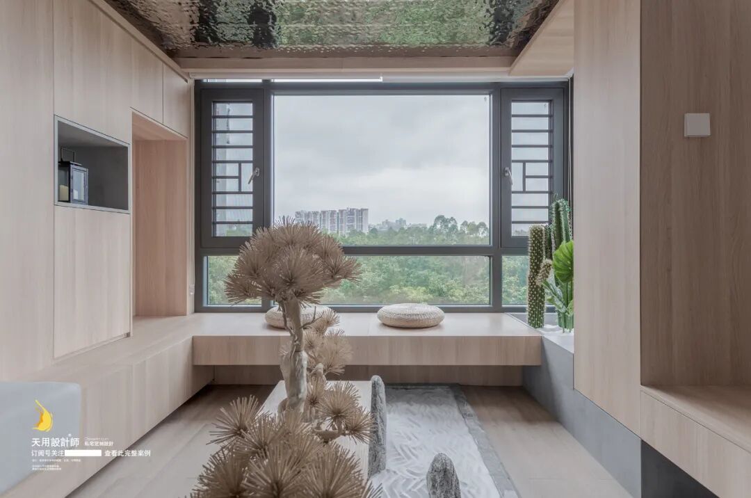 天用设计:在定制地台的蒲团盘腿坐下,看窗外葱葱郁郁的绿色,听空气中流动的风声,想自己的烦恼和快乐,何尝不是一件诗意的事呢?
