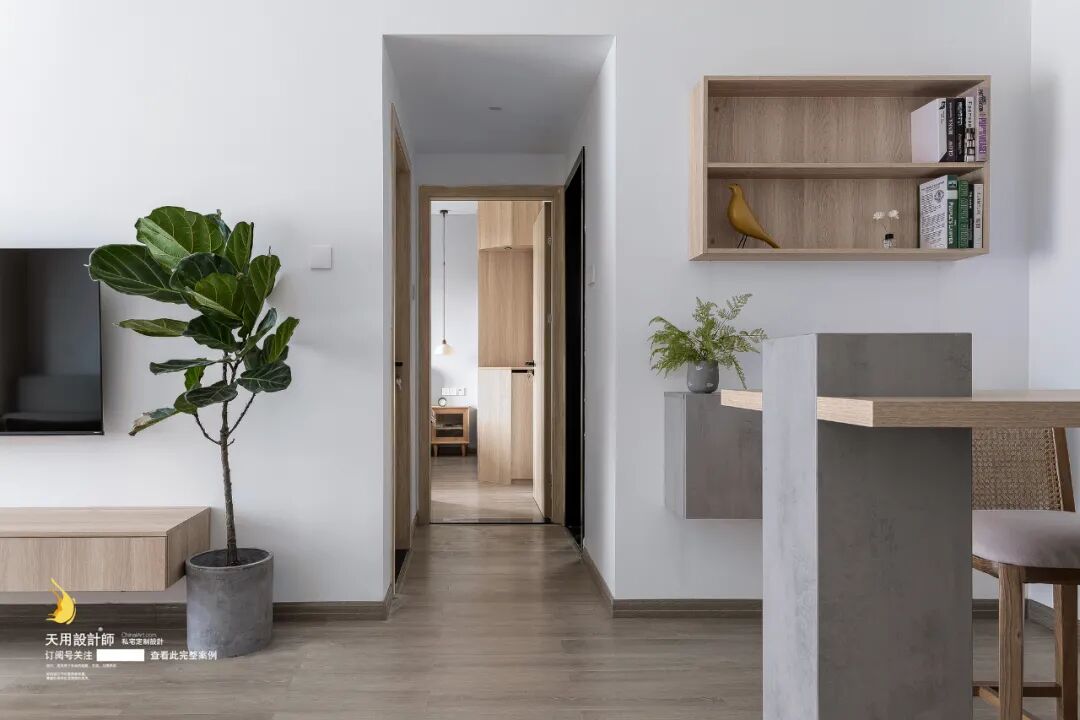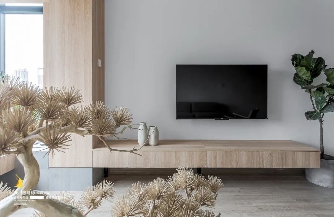 天用设计:电视背景墙是木板包柱连接悬空电视柜,整体呈L型,搭配大白墙,非常干净和素雅。