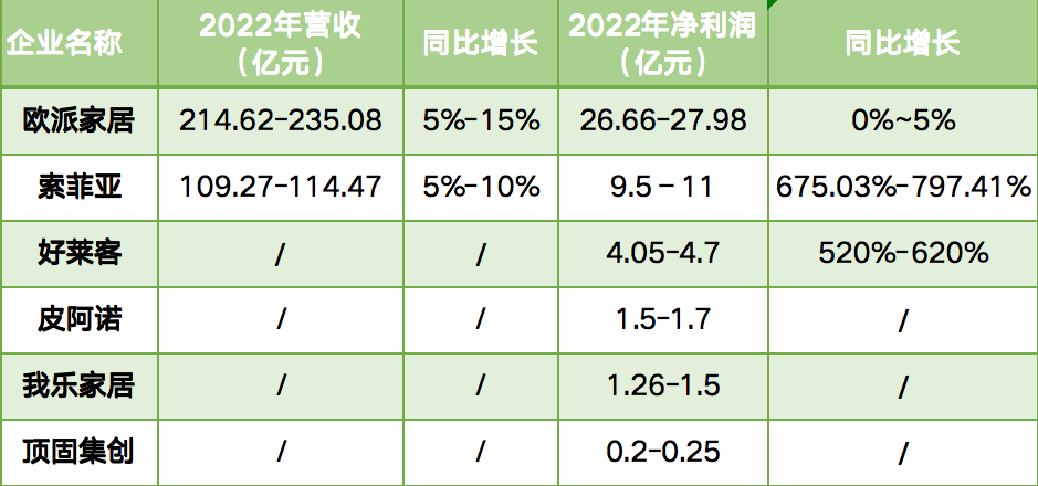 盈利阵营中,龙头企业表现显眼。索菲亚与好莱客分别以797%、620%的净利润上限涨幅遥遥领先;欧派家居凭借27.98亿元的预计归母净利润上限,以及235.08亿元的预计营收上限,稳占头名宝座。
