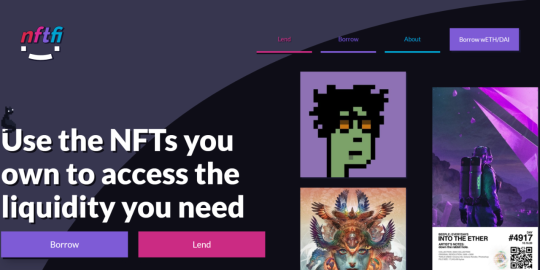NFTFi.com是一个使用拍卖场形式的 P2P NFT 借贷平台, 允许NFT持有者在不卖出他们的NFT的前提下,抵押他们的NFT,从出借方获取资金(WETH和DAI), 资金出借方出借WETH或者DAI,获取利息,如果你到期没还钱,平台会将你的NFT划转给资金出借方。
