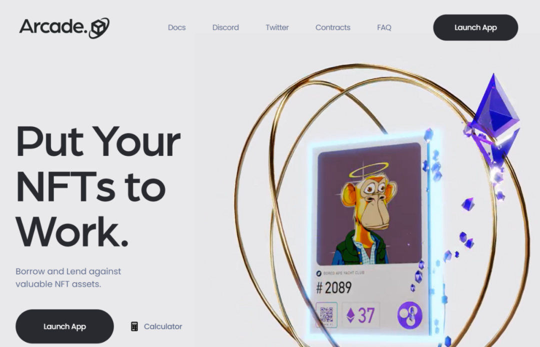 Arcade 是一个专门基于 NFT 借贷建立的非托管流动性基础设施。将 NFT 作为一种金融资产类别来推动其增长。Arcade 使终端用户(包括 NFT 创建者、收藏家和流动性提供者)能够在无数金融用例中利用到他们的NFT。NFT 持有者可以通过 Arcade 应用程序使用他们的一项或多项资产作为抵押品申请贷款。用户只需链接他们的 MetaMask 钱包,然后选择资产(从支持的收藏品列表中)作为抵押品,然后要求提供指定条款的贷款。