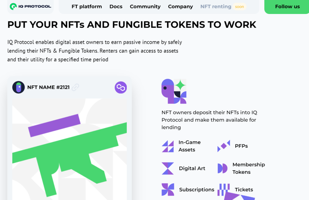 在NFTs的背景下,IQ提供了创建NFT "租赁池 "的能力—允许参与者借出和租赁NFTs的数字空间。从租赁池中租赁NFT的用户将获得对这些NFT资产的真实数字访问,如化身、可穿戴设备/皮肤,以及在网络游戏世界中的资产如武器、财产或其他贵重物品。