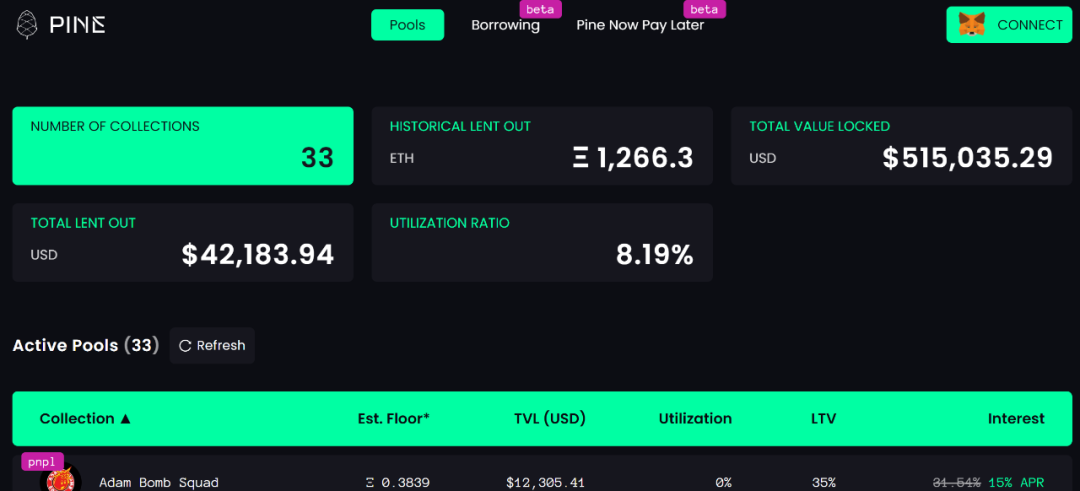 Pine是一个去中心化的支持NFT借贷的协议。Pine Protocol支持在OpenSea上交易的以太坊 NFT作为以ETH支付贷款的抵押品,Alpha版本中抵押品价值通过Opensea API近7天地板价计算。如果借贷人未能在贷款到期前还清债务或超过LTV,资产将会被清算。目前,借贷功能只对PineDAO和少数白名单机构开放。此外,除了以太坊,未来Pine Protocol还计划支持Solana、BSC、Polygon、Avalanche和Fantom等。Pine平台还提供独特的功能以提供更好的用户体验:“Pine Now, Pay Later”功能允许任何人在开放的NFT市场上通过抵押购买NFT,支持灵活的融资条款。