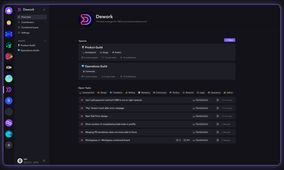 Dework是Web3原生的项目管理平台。具有Token支付、认证、赏金功能。目前已被多个DAO使用,包括OpenDAO、AragonDAO、CityDAO以及ShapeshiftDAO。