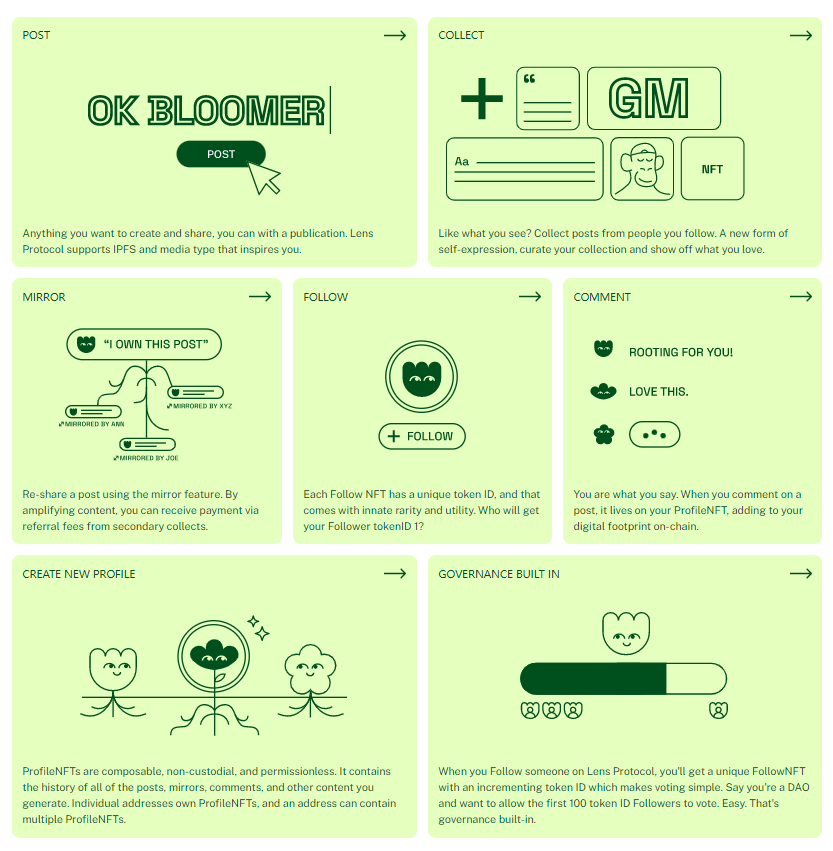 Lens Protocol是Aave团队在Polygon上开发的可组合的去中心化社交图谱,具有一般的社交媒体功能,例如个人资料编辑、评论、转发帖子等。不同的是,Lens Protocol 支持NFT,用户拥有和控制其所创作的所有内容。